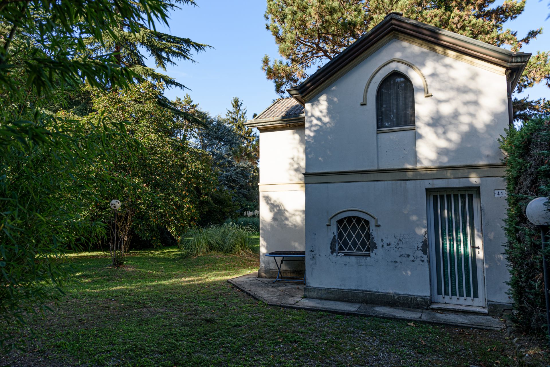 L’edificio padronale è una costruzione lineare col tetto a due falde, inserito in un bel giardino di conifere con grandi esemplari di latifoglie. La torre colombaia aveva originariamente forme elaborate, probabilmente nell’Ottocento sostituite da un neogotico torrione a chiusura scenografica del giardino romantico sul retro.