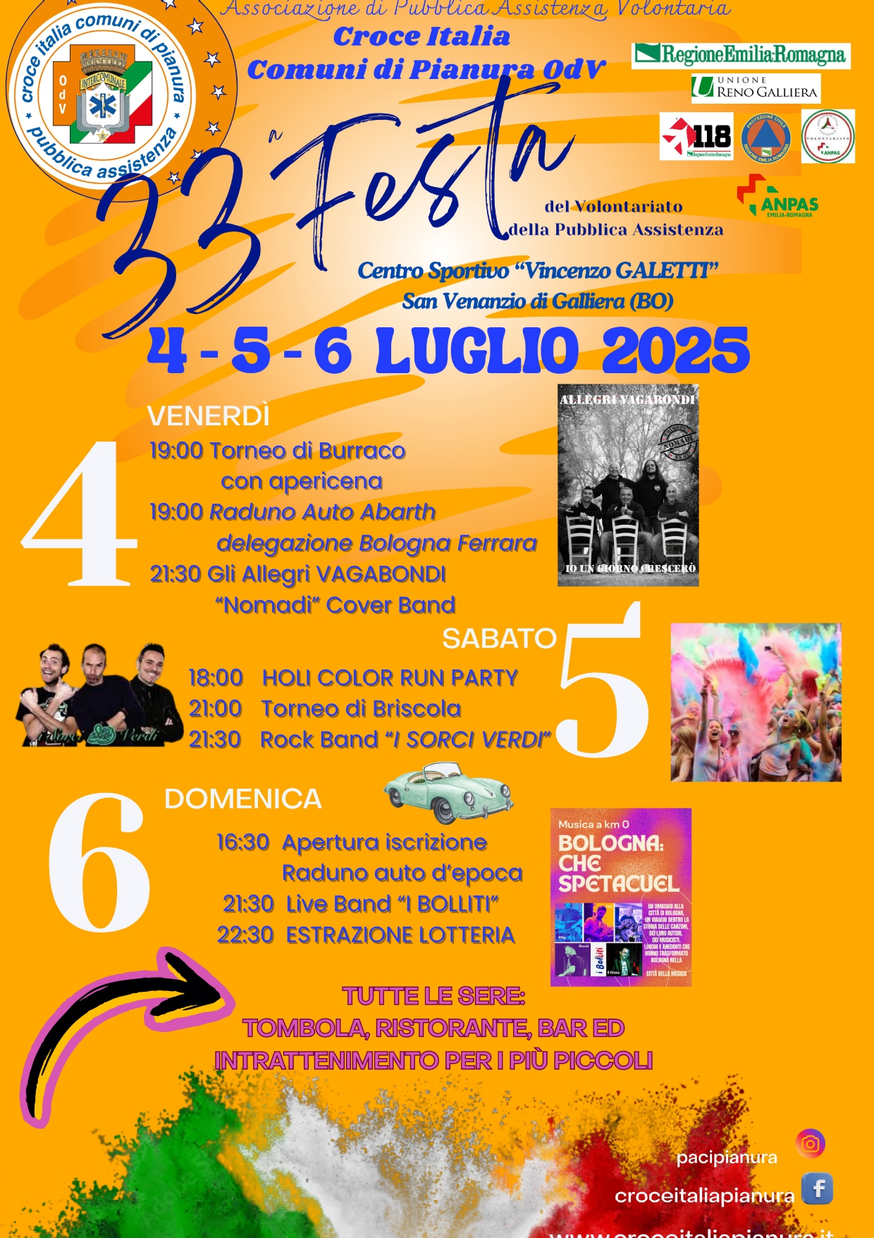 Con il patrocinio del Comune di Baricella, da venerdì 4 Luglio a Domenica 6 Luglio 2025 si terrà la 33° Festa del Volontariato presso il centro sportivo "Vincenzo Galetti" in Via San Venanzio di Galliera, organizzata dai volontari della P.A Croce Italia Comuni di Pianura.