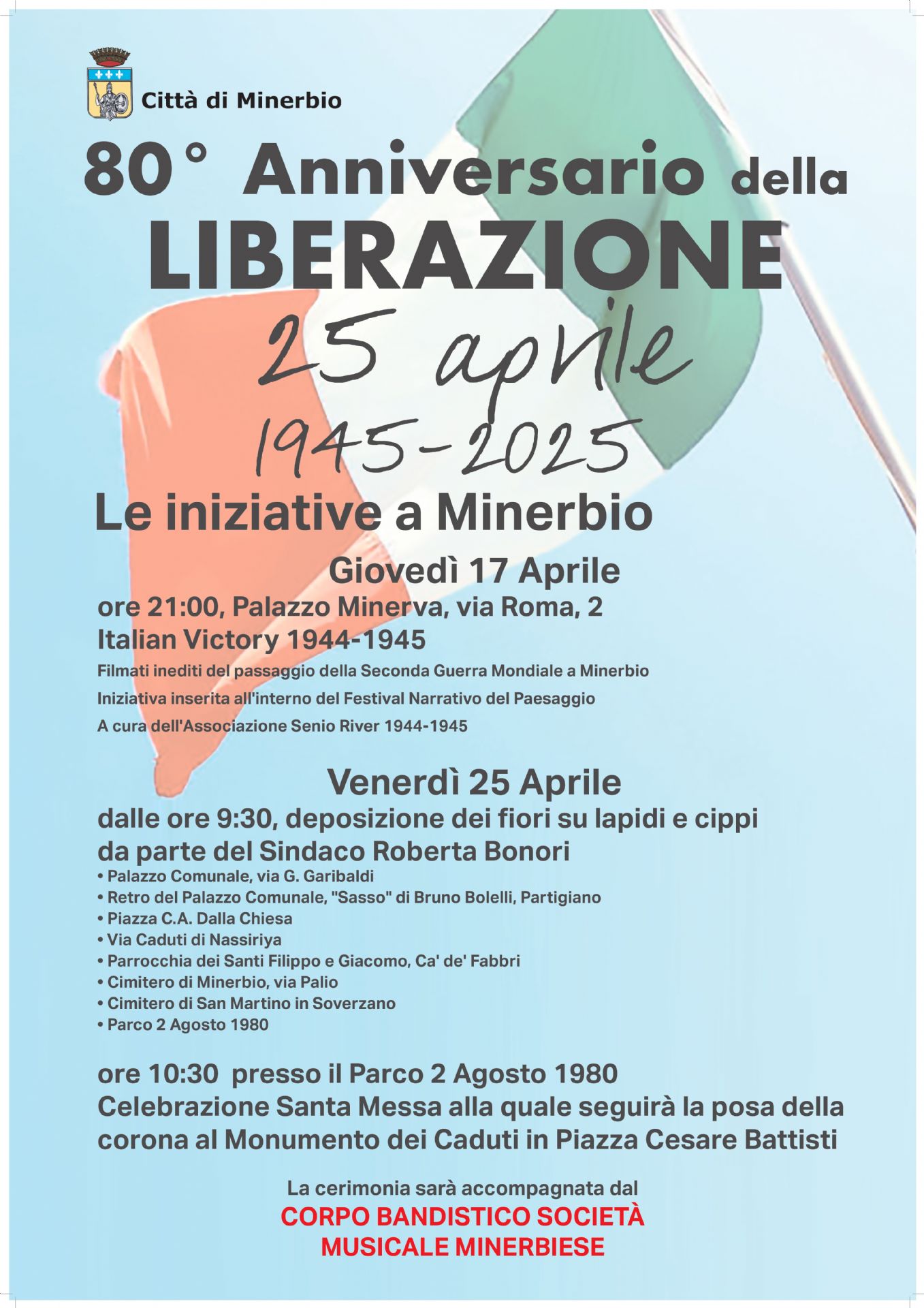 Il Comune è lieto di invitarvi a due importanti eventi per commemorare l’80° anniversario del 25 aprile, simbolo di libertà e democrazia per l’Italia.