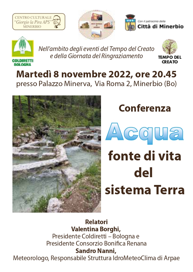 Nell’ambito degli eventi del Tempo del Creato e della Giornata del Ringraziamento, il Centro Culturale “G. La Pira APS” organizza martedì 8 novembre 2022 alle ore 20.45 presso il teatro Palazzo Minerva, Via Roma 2, Minerbio la conferenza dal titolo "Acqua: fonte di vita del sistema Terra"