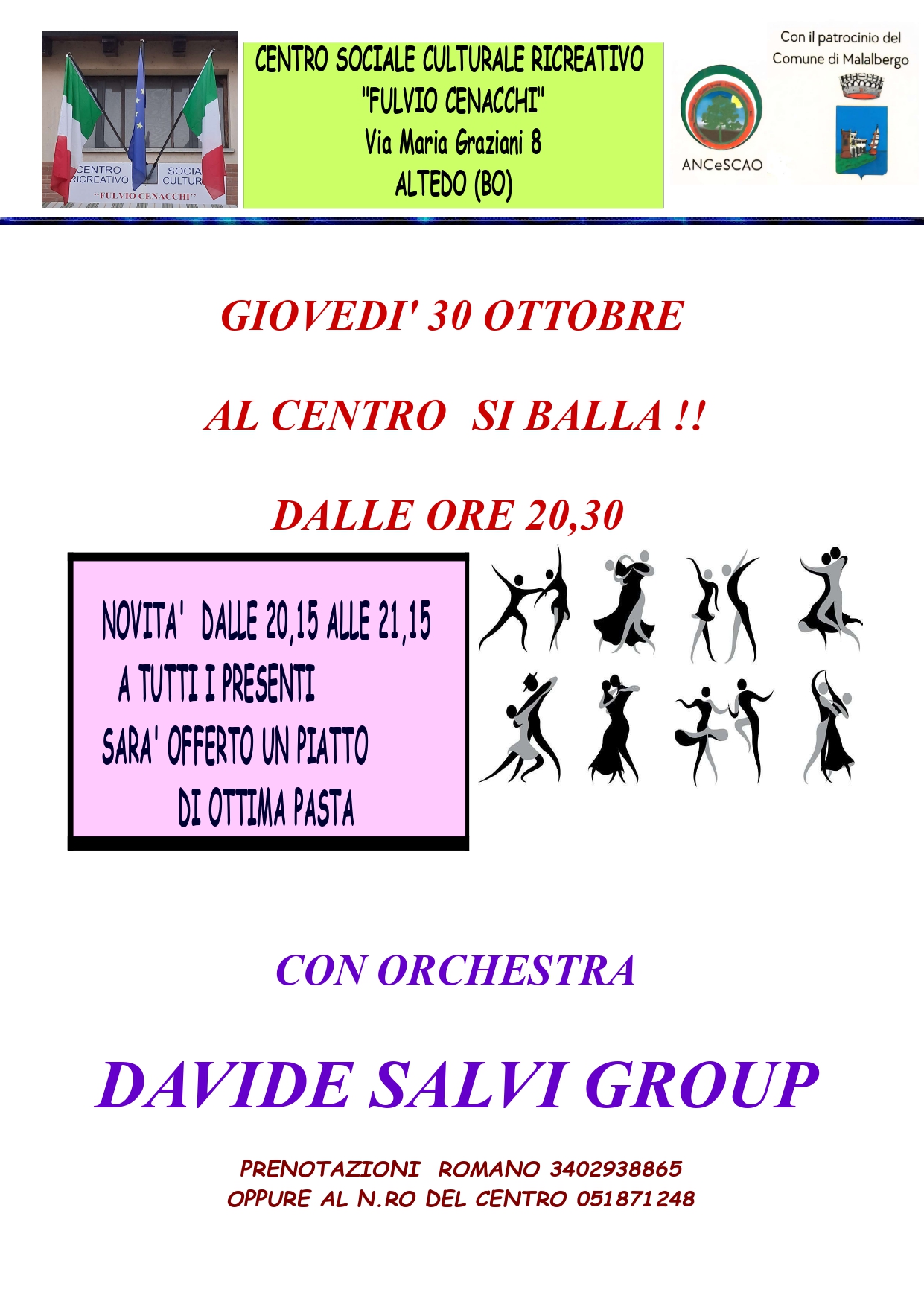 Per prenotazioni 051/871248 oppure Romano 340/2938865