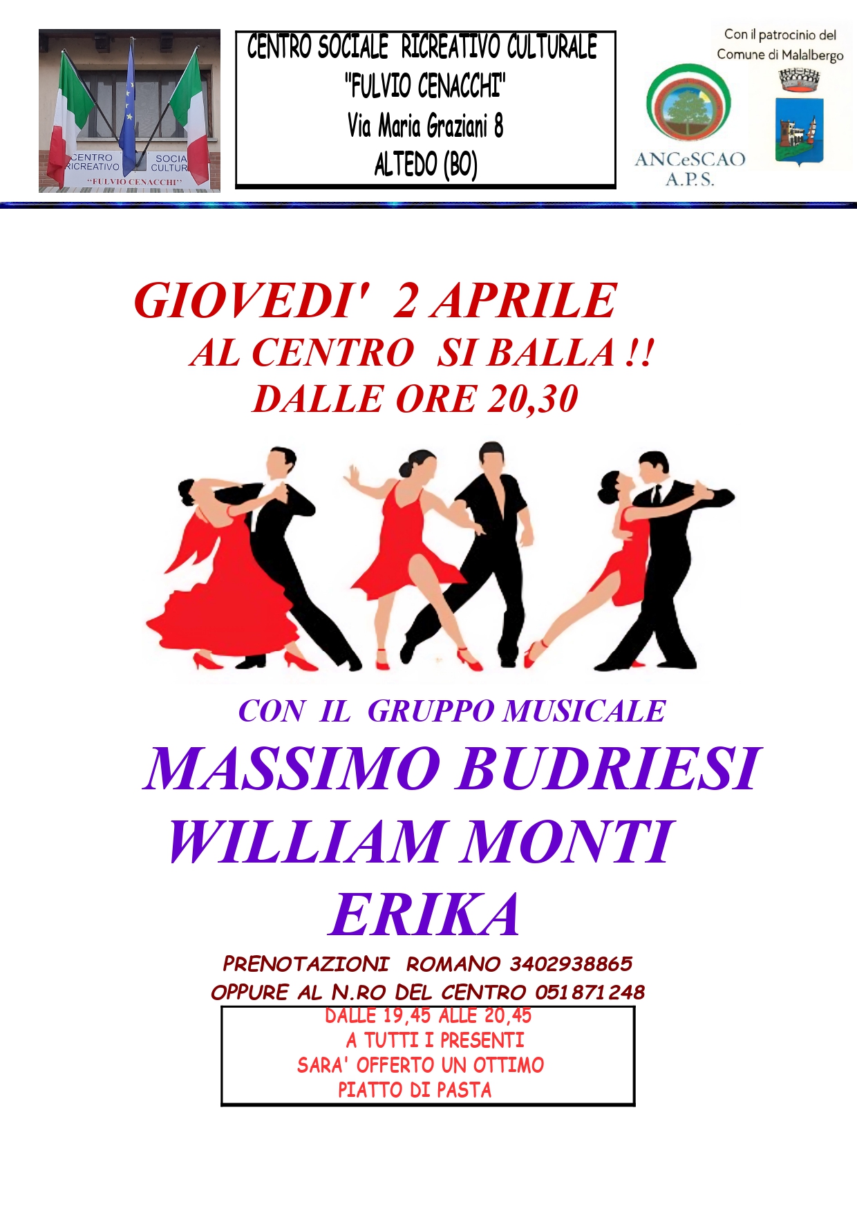 Dalle ore 19:45 alle 20:45 a tutti i partecipanti verrà offerto un piatto di ottima pasta al Centro Sociale Ricreativo Culturale "Fulvio Cenacchi", Via M. Graziani n.8 ad Altedo.