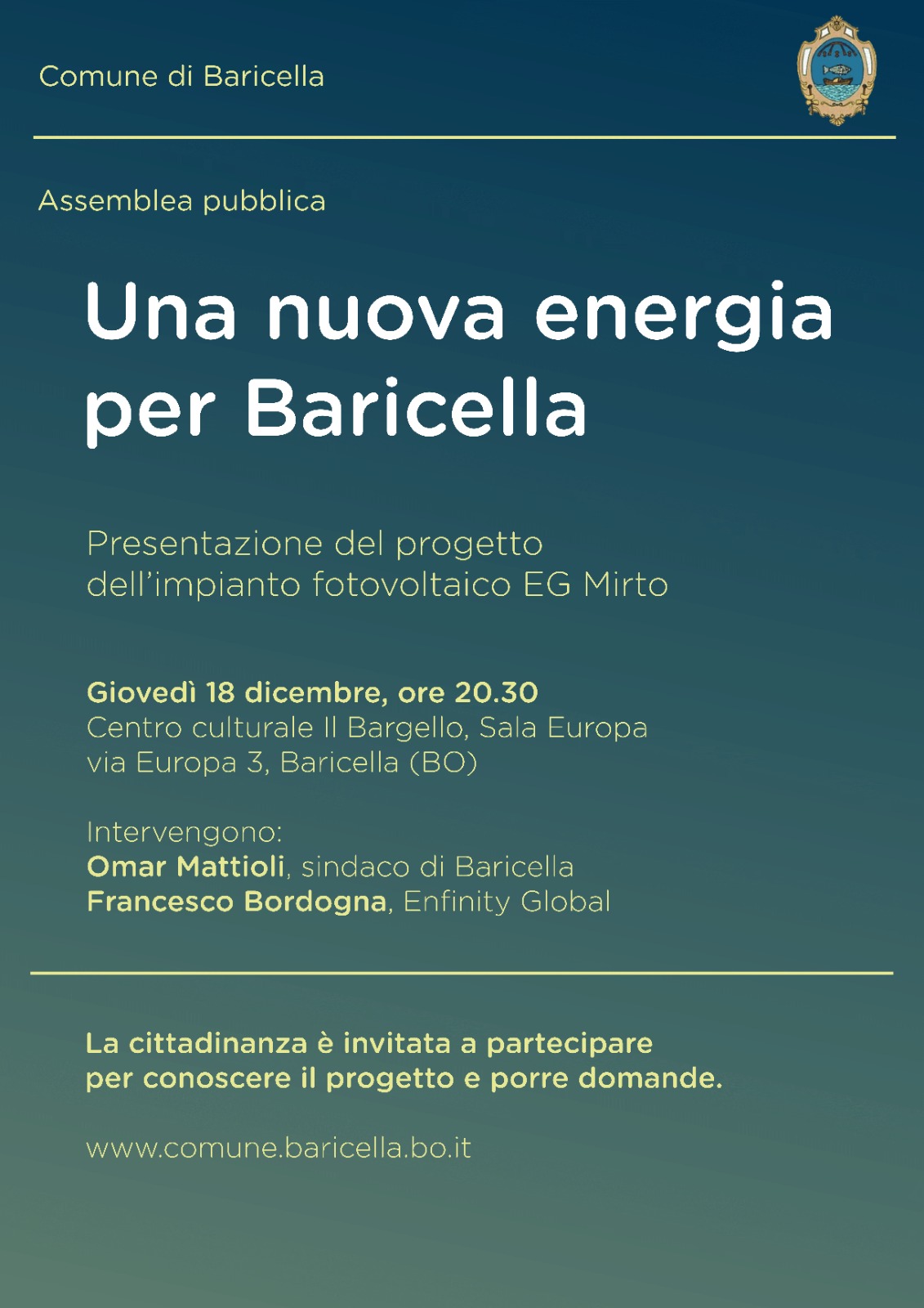 Giovedì 18 dicembre alle ore 20:30, presso la Sala Europa del Centro Culturale Il Bargello (Via Europa n. 3) si terrà un'assemblea pubblica dedicata alla presentazione del progetto dell’impianto fotovoltaico elaborato da EG Mirto.