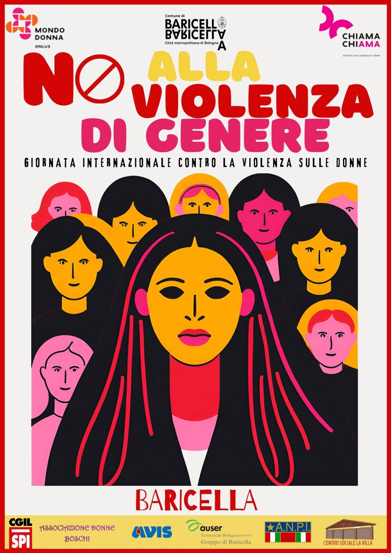 In occasione della Giornata internazionale contro la violenza sulle donne, il Comune di Baricella è lieto di annunciare una serie di iniziative di sensibilizzazione a supporto delle donne, organizzate con la collaborazione dell'Associazione MondoDonna Onlus e del Centro Antiviolenza CHIAMA ChiAMA e con la partecipazione di SPI Cgil, Avis, ANPI, Auser, Associazione Donne di Boschi e Centro sociale la Villa.