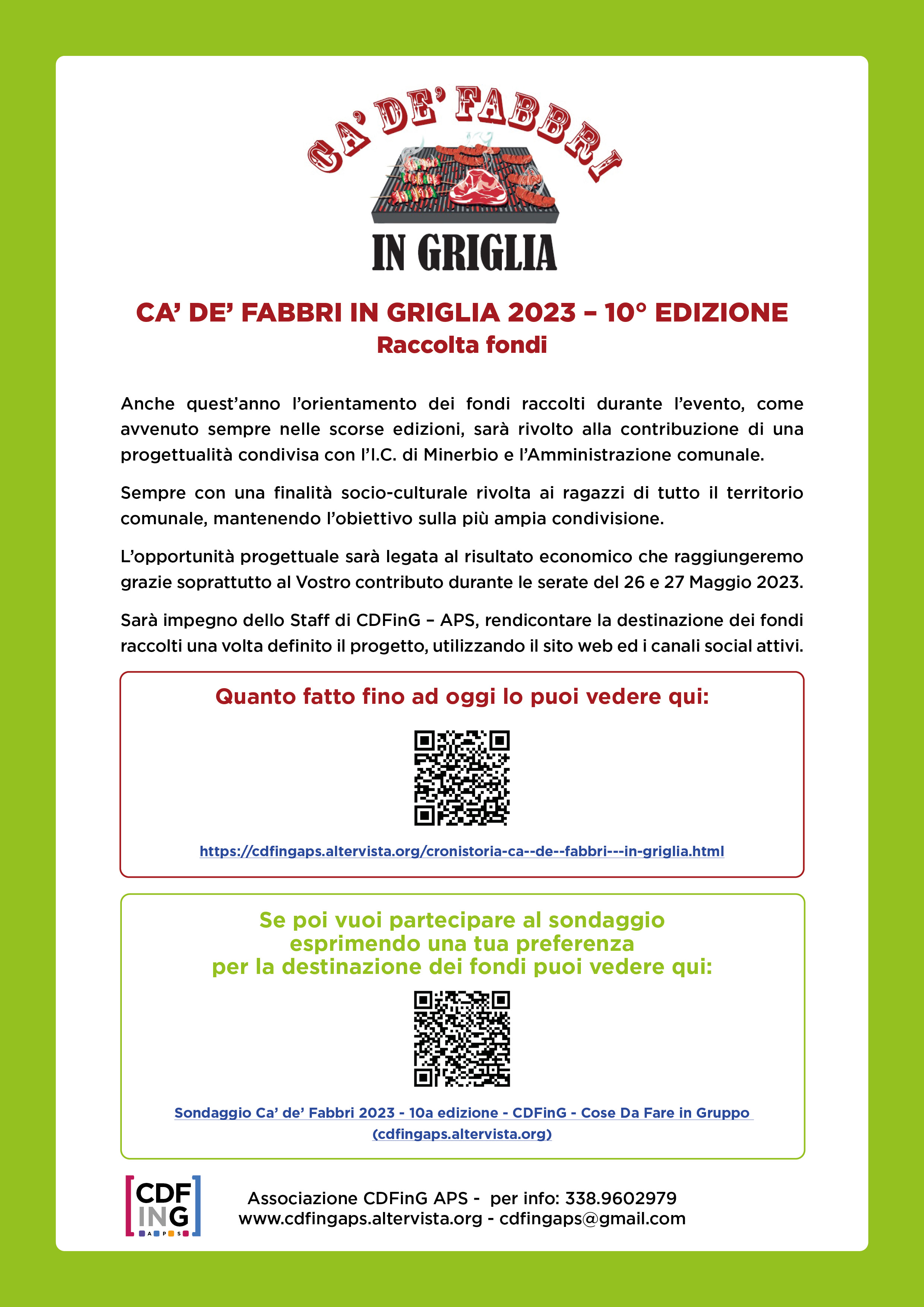 L'associazione GDFinG in collaborazione con Amica Asd e Pro Loco di Minerbio e con il patrocinio e il contributo del Comune di Minerbio organizza venerdì 26 e sabato 27 maggio 2023 presso il Centro Sportivo D. Passarini a Ca' de' Fabbri la 10° edizione di Ca' de' Fabbri in Griglia.