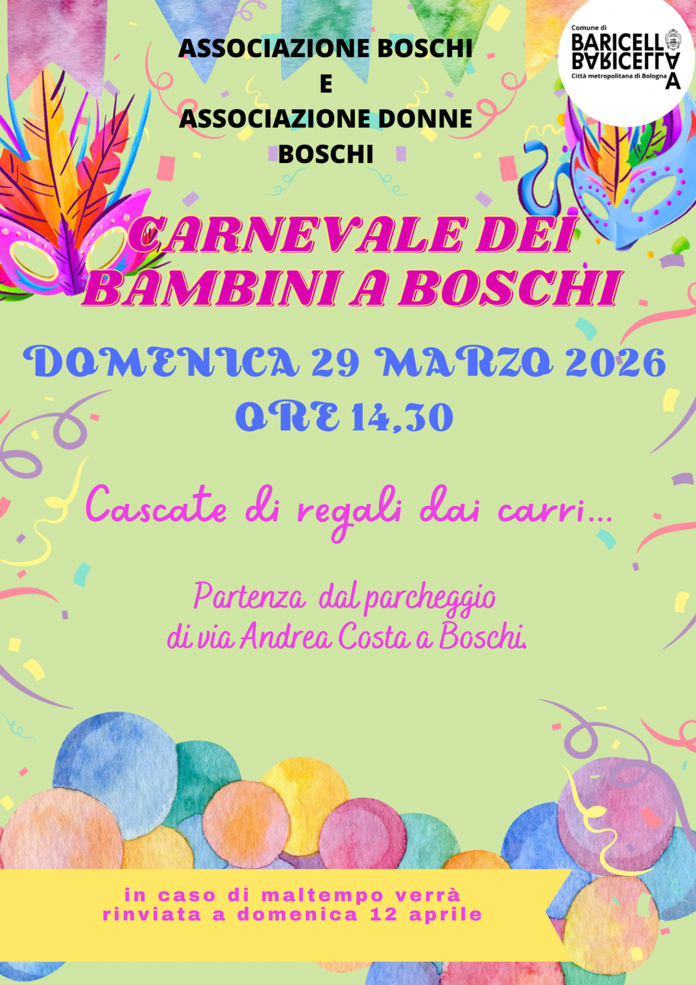 Domenica 29 Marzo 2026 torna a Boschi il tradizionale Carnevale dei bambini che coinvolge tutta la popolazione con i festeggiamenti carnascialeschi, la sfilata di carri e le cascate di regali!