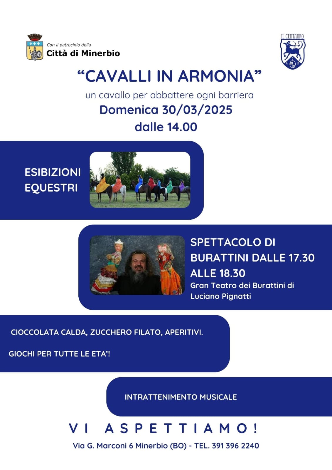 Domenica 30 marzo 2025 si terrà l'inaugurazione del progetto "Cavalli in armonia" - patrocinato dal Comune di Minerbio - presso il Centro Equestre GSD il Centauro, in via G. Marconi, 6, a Minerbio, a partire dalle ore 14:00.