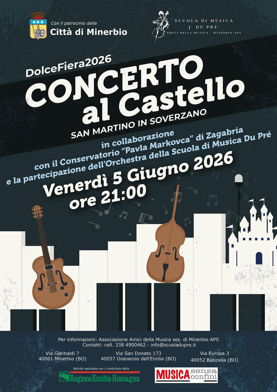Nell'ambito delle iniziative de La Dolce Fiera 2026, con il Patrocinio del Comune di Minerbio, sabato 5 giugno alle ore 21.00 presso il Castello dei Manzoli a San Martino in Soverzano, l'associazione Amici della Musica sez. di Mineerbio organizza "Concerto al Castello", concerto in collaborazione con il Conservatorio Pavla Markovca di Zagabria e l'orchestra della Scuola di Musica J. Du Pré.