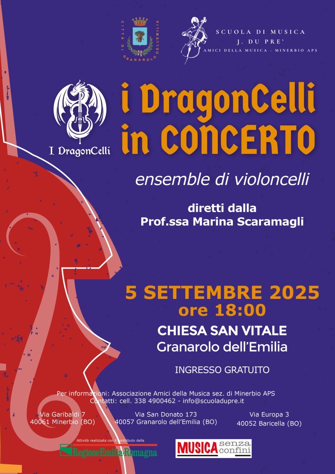 Venerdì 5 settembre, alle ore 18.00, presso la Chiesa di San Vitale di Granarolo dell’Emilia, si terrà il concerto dell’ensemble di violoncelli “I DragonCelli”, diretto dalla Prof.ssa Marina Scaramagli.
