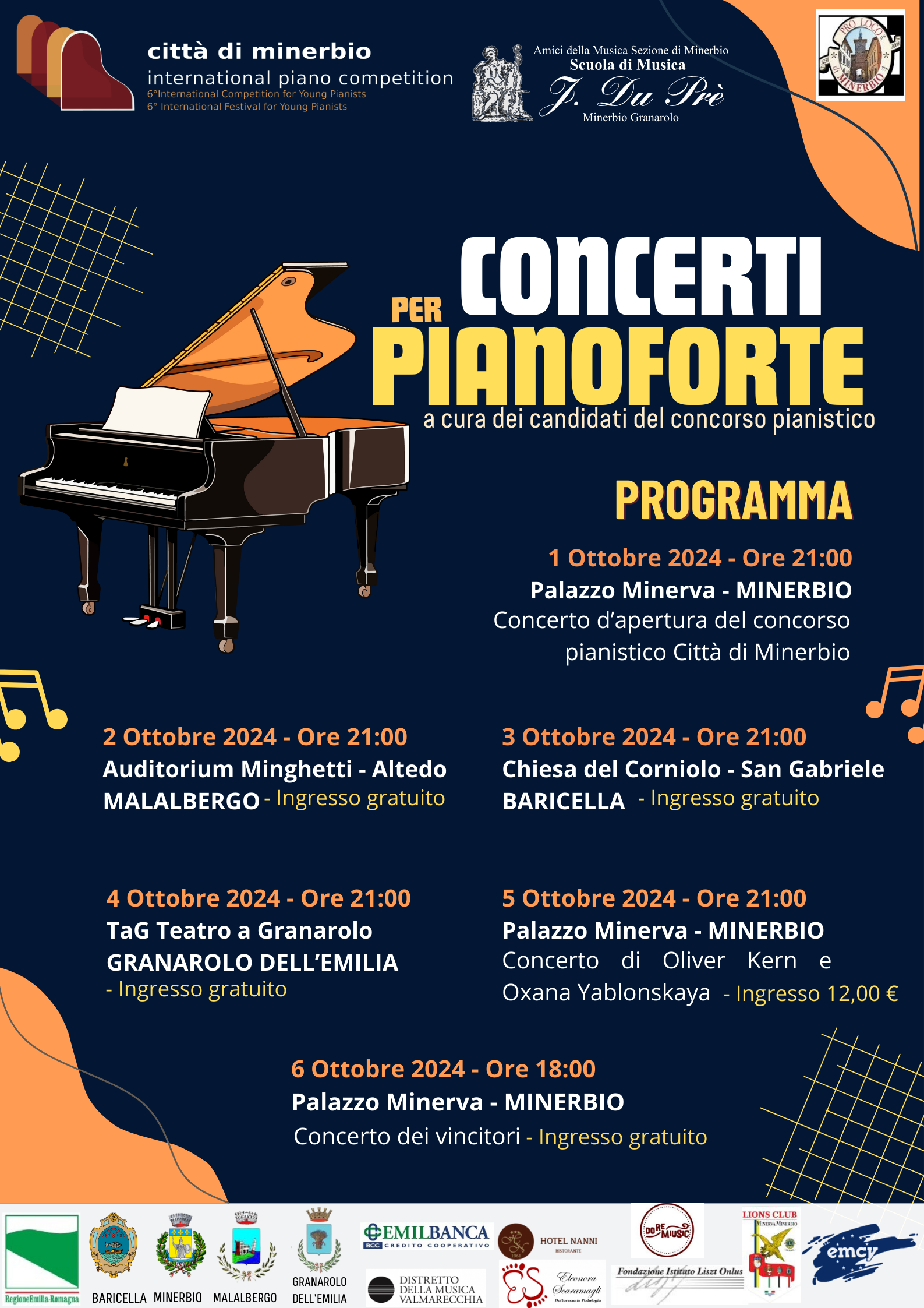 Dall'1 al 6 ottobre 2024 la Città di Minerbio ospiterà l'ottava edizione del Concorso Pianistico internazionale "Città di Minerbio": un calendario ricco di concerti diffusi per il territorio minerbiese e nei comuni limitrofi di Baricella, Granarolo dell'Emilia e Malalbergo .