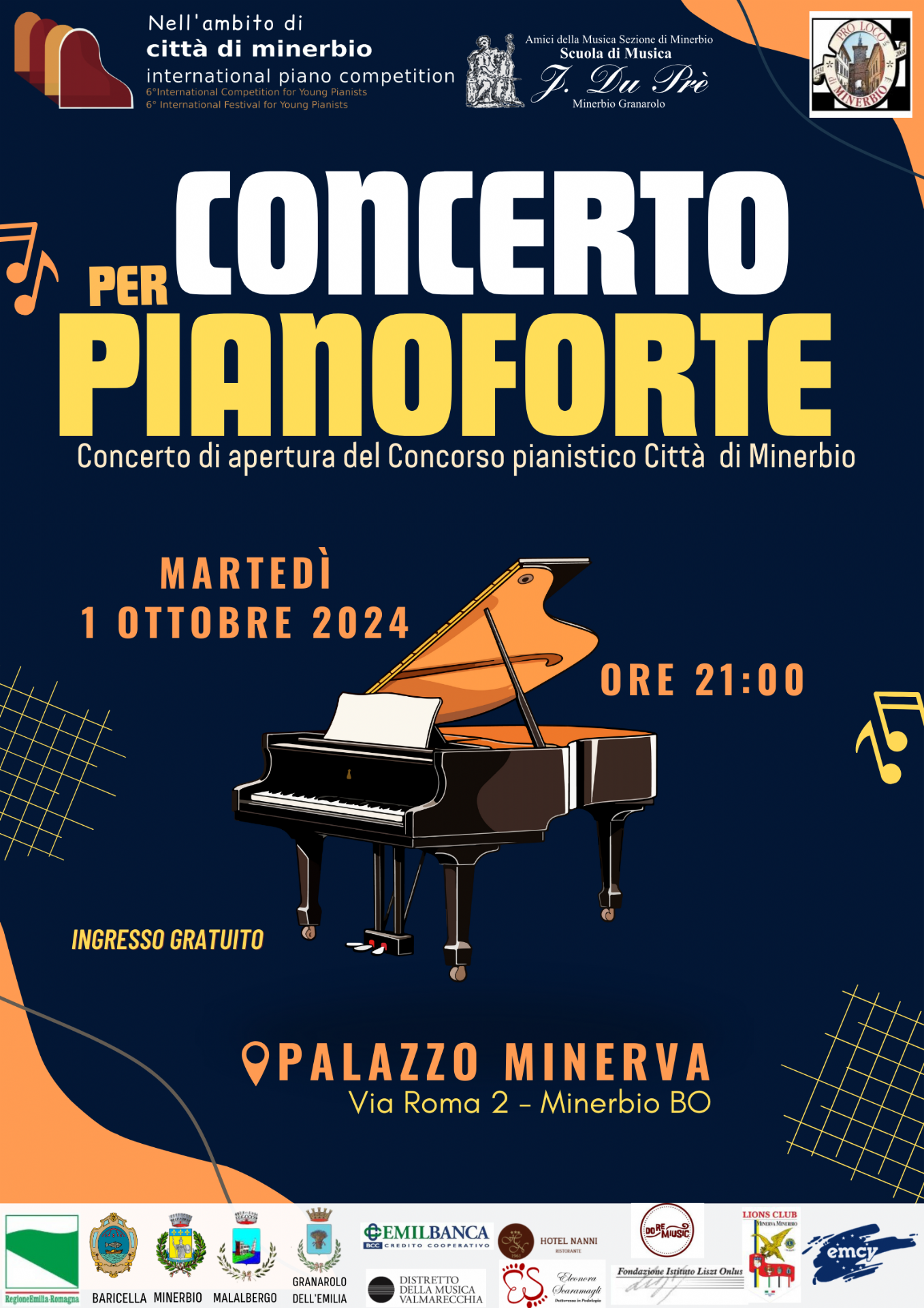 Il concerto per pianoforte e la cerimonia di apertura si terranno a Palazzo Minerva martedì 1 ottobre alle ore 21.00, in via Roma, 2 a Minerbio.