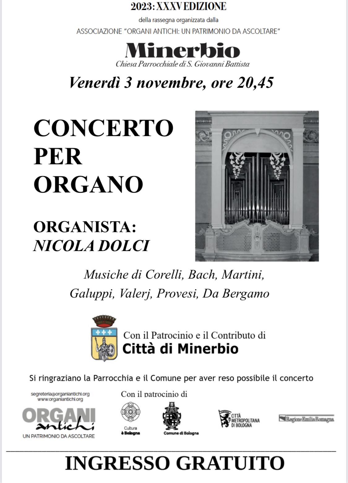Venerdì 3 novembre 2023 alle ore 20.45 presso la Chiesa parrocchiale di San Giovanni Battista di Minerbio si terrà il concerto per organo della 35° edizione della rassegna organizzata dall'associazione "Organi antichi: un patrimonio da ascoltare".