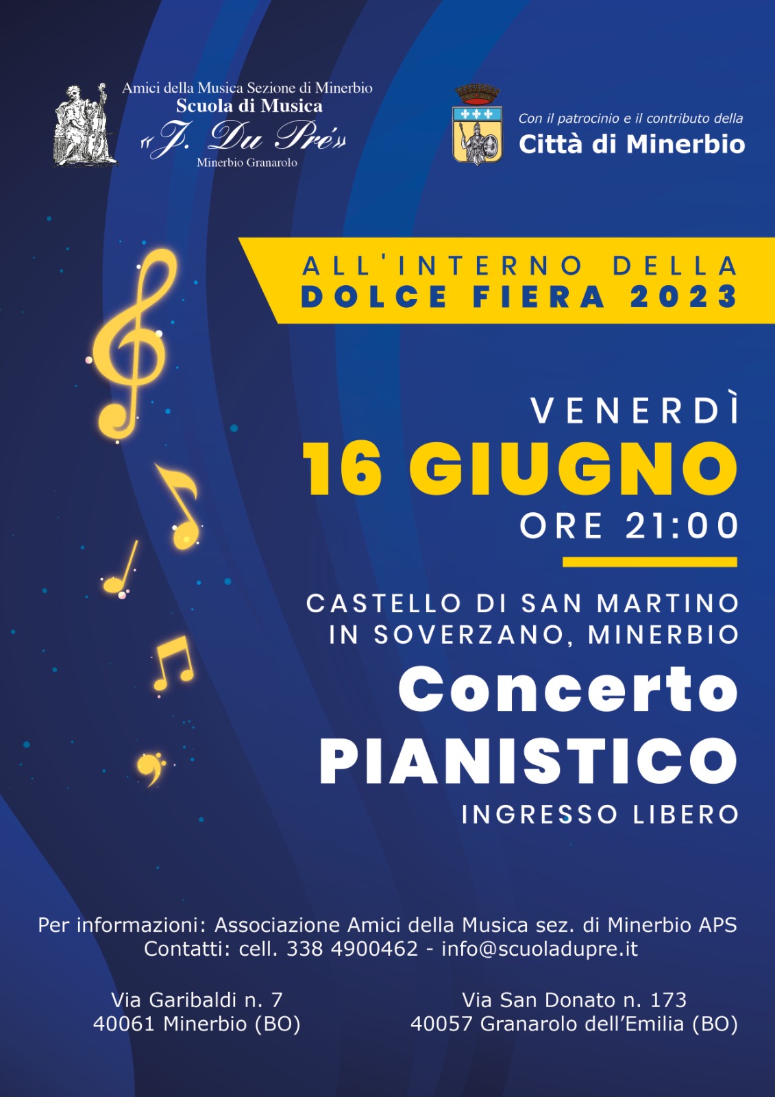 In occasione de LA DOLCE FIERA 2023, venerdì16 giugno alle ore 21.00 presso il Castello dei Manzoli a San Martino in Soverzano, si terrà il tradizionale CONCERTO PIANISTICO a cura dell'associazione Amici della Musica sezione di Minerbio - Scuola di Musica J. Du Pré.