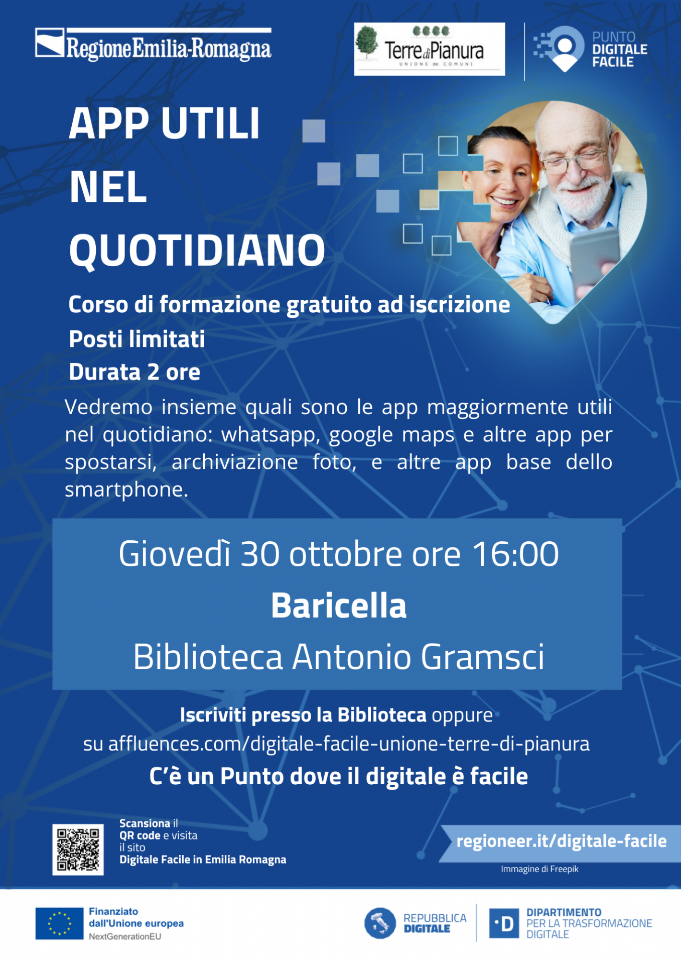 Vuoi migliorare le tue competenze digitali e imparare ad utilizzare al meglio le app più utili nella vita di tutti i giorni? Partecipa anche tu al corso gratuito di formazione dedicato previsto in data Giovedì 30 ottobre alle ore 16:00, presso la Biblioteca A. Gramsci di Baricella.