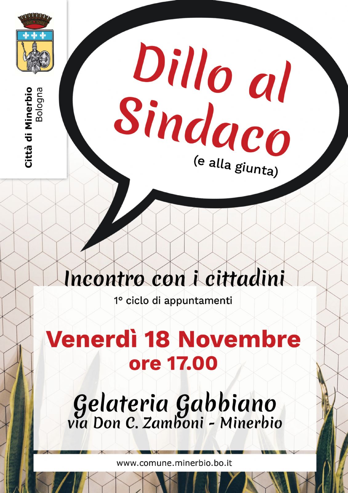 Venerdì 18 novembre, alle ore 17, presso la Gelateria il Gabbiano, via Don Zamboni, ci sarà il primo ciclo di appuntamenti con "Dillo al Sindaco" e alla Giunta.