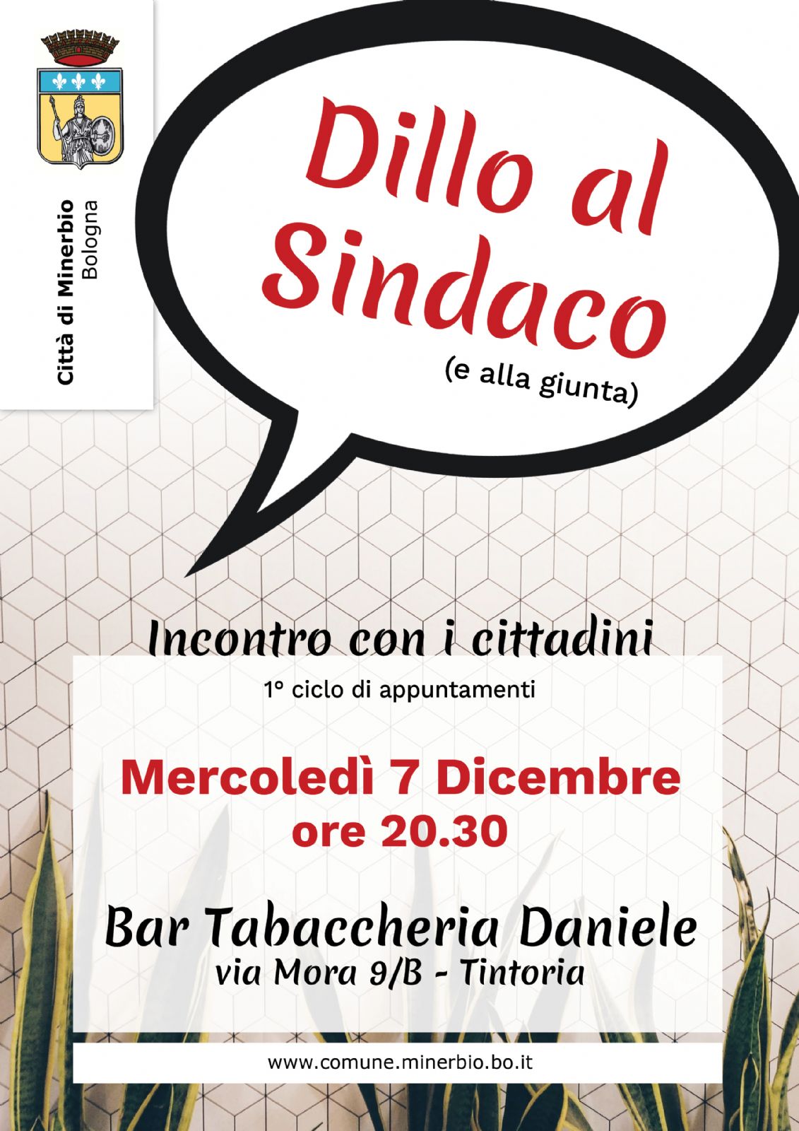 Mercoledì 7 dicembre, alle ore 20:30, presso Bar Tabaccheria Daniele, via Mora, 9/B Tintoria, ci sarà il terzo appuntamento del ciclo di incontri "Dillo al Sindaco" e alla Giunta.