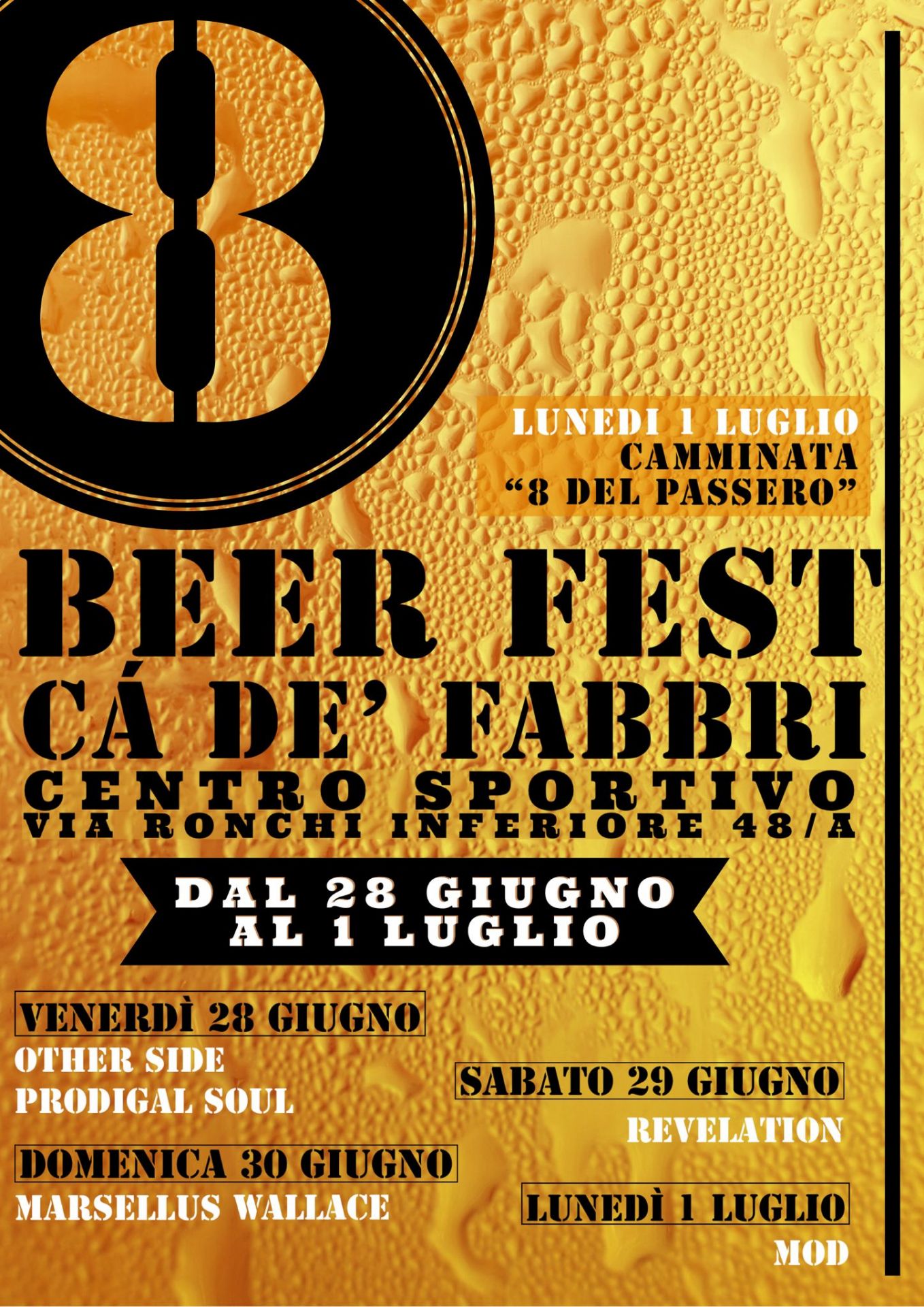 Da venerdì 28 giugno a lunedì 1 luglio a Ca' De Fabbri, presso il Centro sportivo di Via Ronchi Inferiore, si terrà la la 8 Beer Fest.