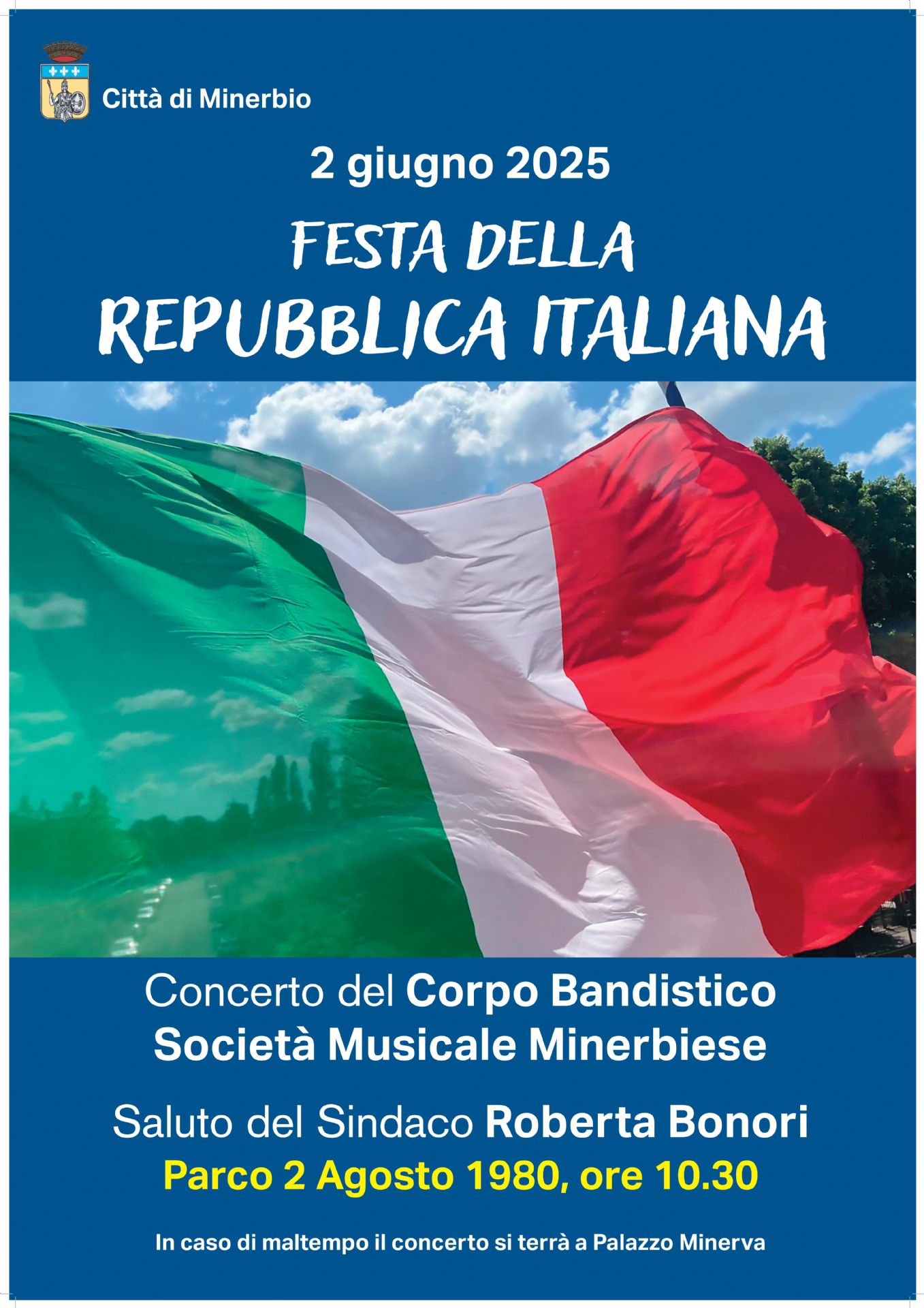 Il Comune di Minerbio celebrerà la festa lunedì 2 giugno alle ore 10:30 presso il Parco 2 Agosto 1980 con l'esibizione del Corpo Bandistico Città di Minerbio.