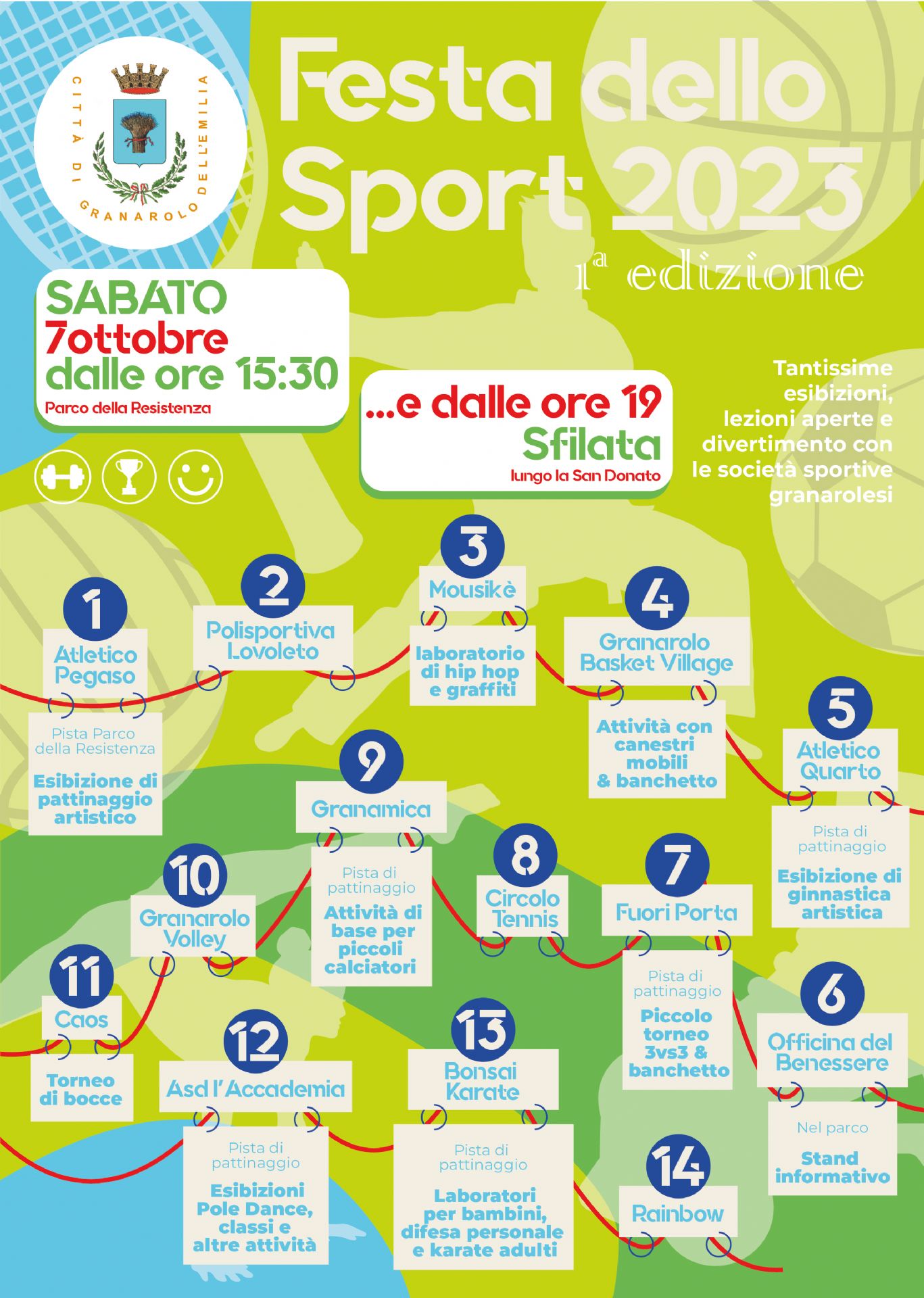 A partire dalle ore 15.30 del sabato al Parco della Resistenza, nel centro del capoluogo, le associazioni dello sport daranno vita a un vero e proprio Villaggio dello Sport con tantissime esibizioni, lezioni aperte e promozione delle proprie attività, per incontrare tutti coloro che ancora non praticano uno sport o che vogliono saperne di più sull’offerta di discipline e corsi che si può trovare a Granarolo.