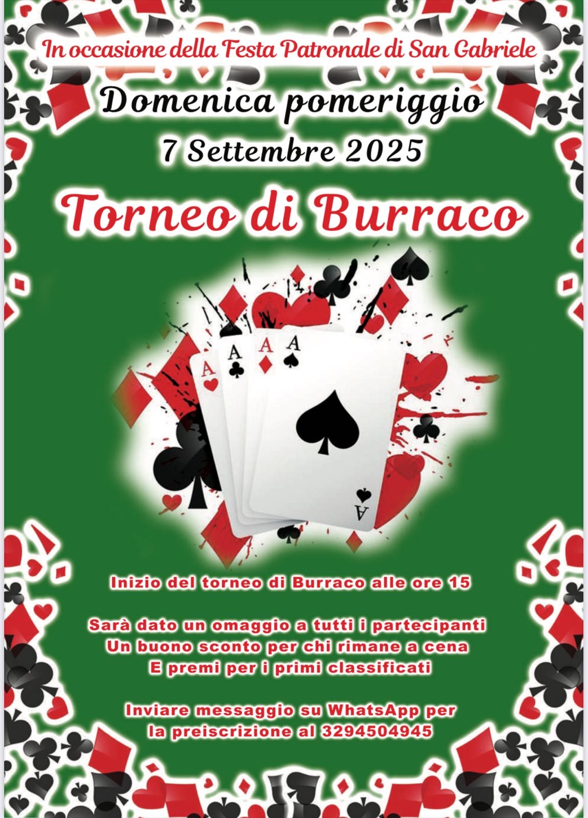 - Ore 15:00 - Torneo di Burraco presso la tensostruttura della parrocchia di San Gabriele.