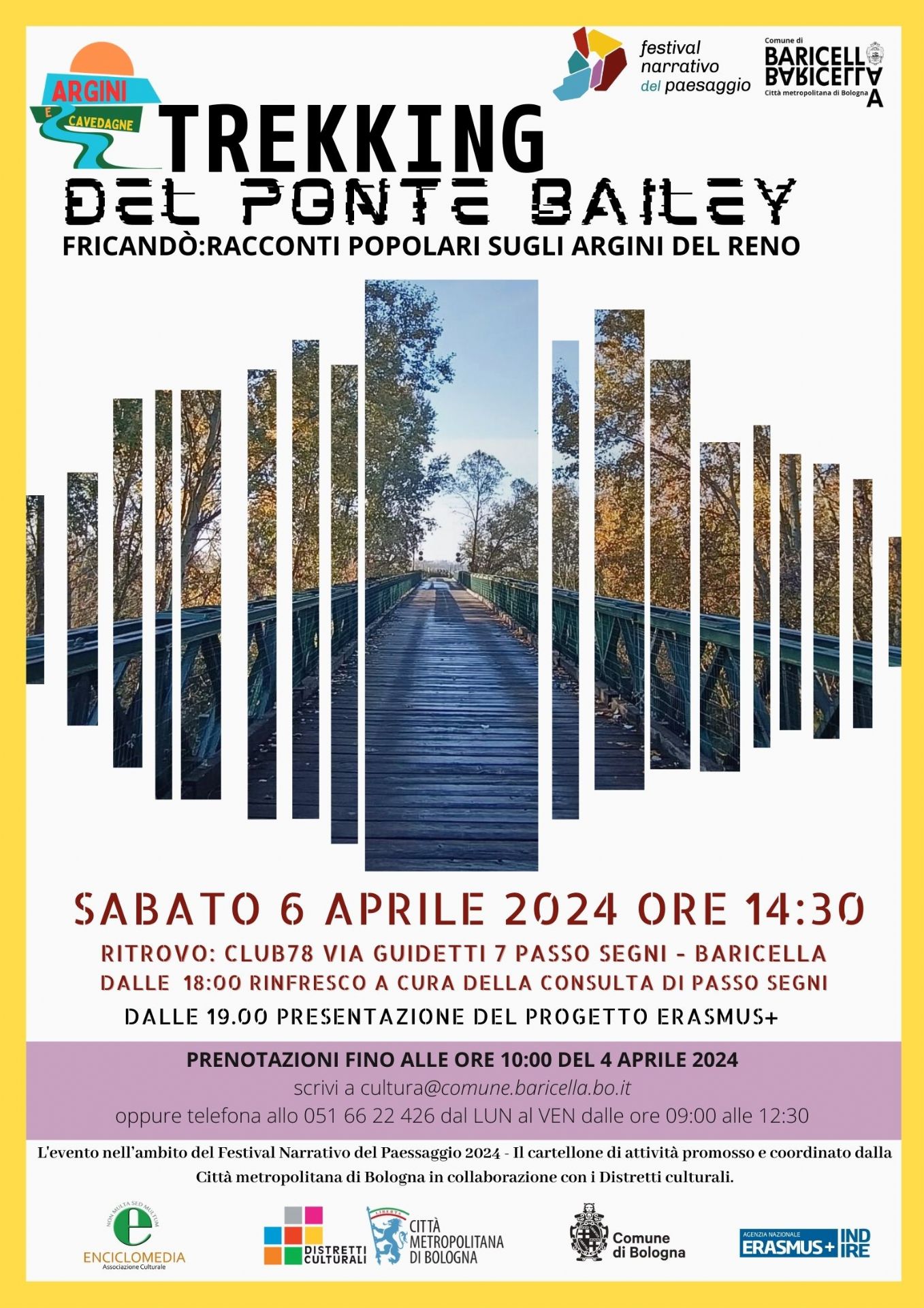 Un trekking ad anello lungo gli argini del Reno, la cui storia è legata a quella della nostra pianura e in particolar modo di Passo Segni, il piccolo borgo che per i baricellesi sorge “al di là del Reno”. Le soste lungo il percorso saranno animate dagli interventi artistici di narrazione teatralizzata, a cura di Carlotta Grillini, di aneddoti, storie e modi di dire arrivati a noi grazie allo storico locale Gastone Quadri, che li ha raccolti magistralmente nella raccolta "Fricandò", termine mutuato dal dialetto bolognese e che vuol dire "di tutto un po'".