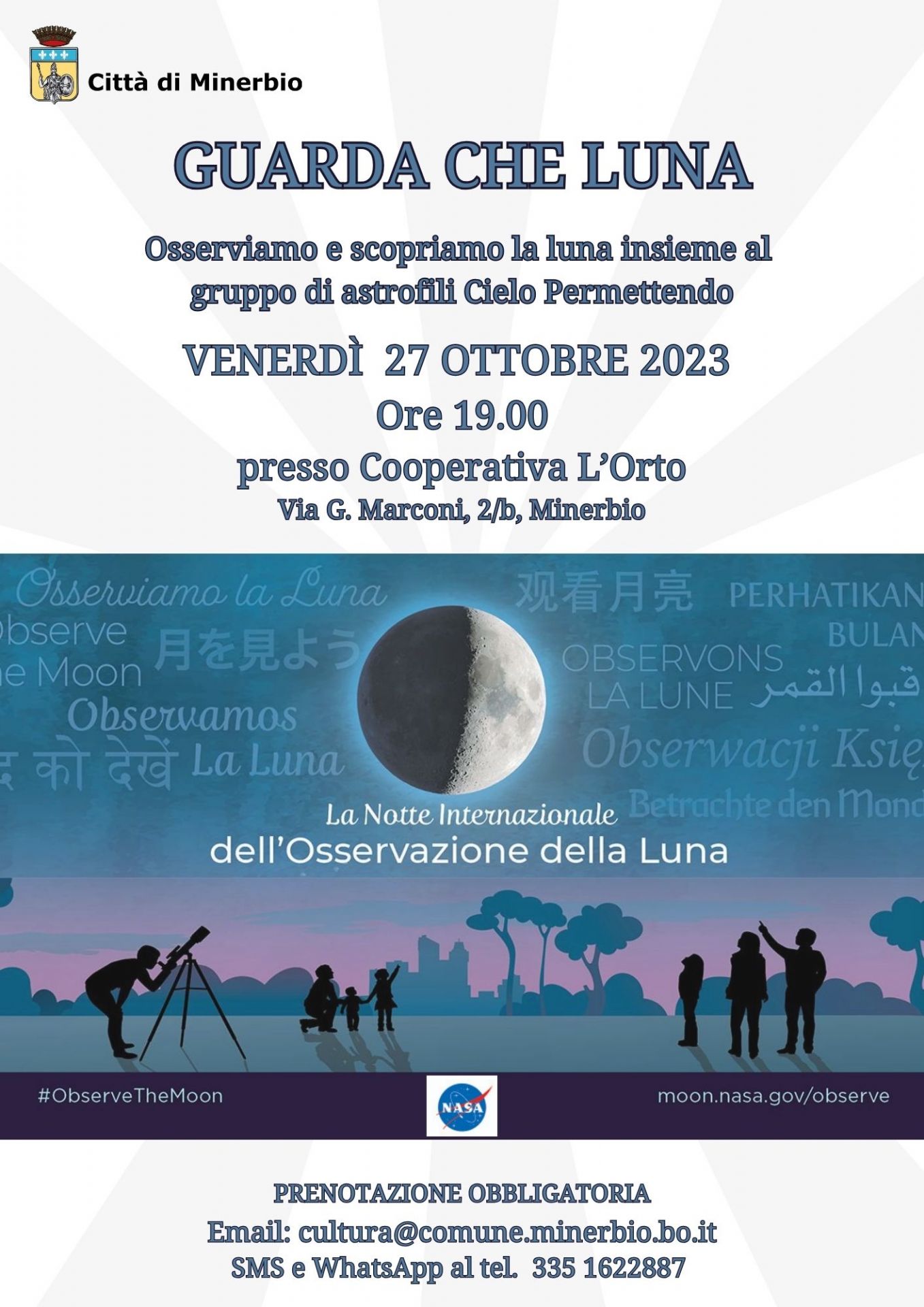 Venerdì 27 ottobre 2023, in occasione della Notte Internazionale dell’Osservazione della Luna, patrocinata della divisione di scienze ed esplorazione planetarie della NASA, alle ore 19.00 presso la Cooperativa L'Orto (via Marconi, 2/b, Minerbio) si svolgerà l'iniziativa GUARDA CHE LUNA, un evento pubblico annuale di divulgazione mondiale che si prefigge lo scopo di incoraggiare l’osservazione, la conoscenza e la comprensione della nostra Luna, con Andreita e Damiano del gruppo di astrofili Cielo Permettendo.