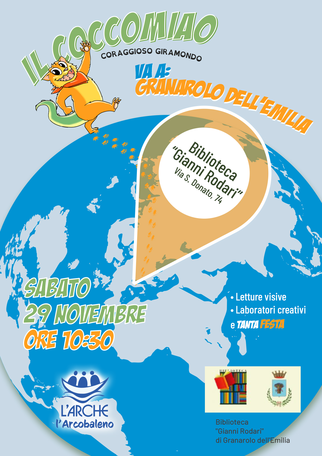 Sabato 29 novembre, dalle ore 10:30, la Biblioteca "Gianni Rodari" ospiterà un evento speciale dedicato ai più piccoli: "Il Coccomiao - Coraggioso Giramondo va a Granarolo dell'Emilia ".