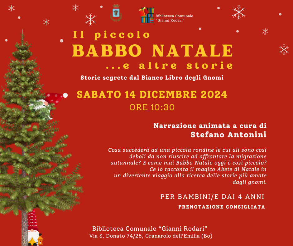 La Biblioteca Comunale "Gianni Rodari" di Granarolo dell'Emilia si prepara ad accogliere i più piccoli per un evento natalizio unico e coinvolgente! Sabato 14 dicembre 2024, alle ore 10:30, i bambini dai 4 anni in su saranno trasportati in un mondo di fiabe e magia con "Il piccolo Babbo Natale e altre storie – Storie segrete dal Bianco Libro degli Gnomi", una narrazione animata a cura di Stefano Antonini.