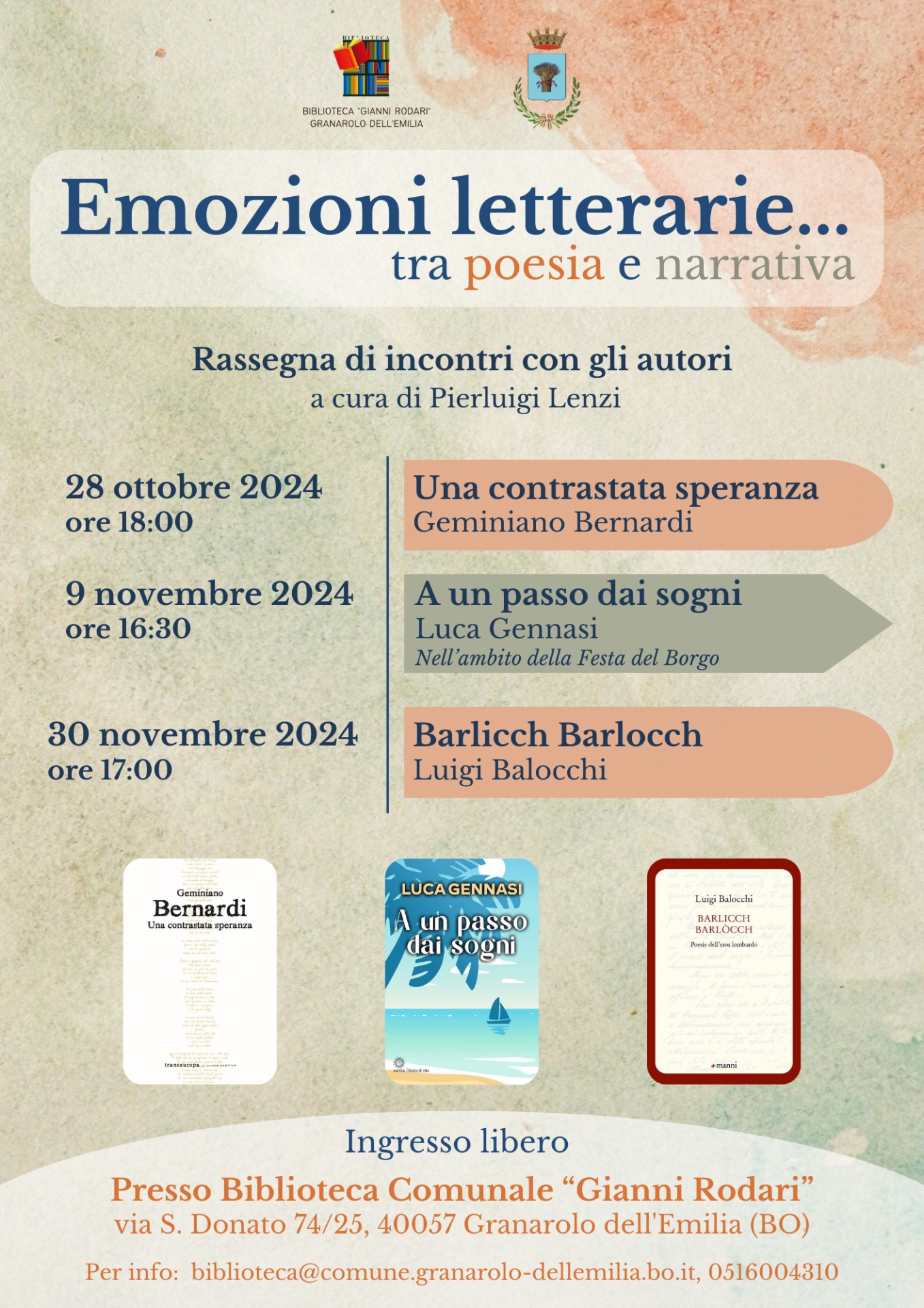 Il 30 novembre 2024 alle ore 17:00, la Biblioteca Comunale "Gianni Rodari" di Granarolo dell’Emilia ospiterà l’ultimo appuntamento della rassegna "Emozioni letterarie… tra poesia e narrativa". L'incontro vedrà protagonista Luigi Balocchi, autore del libro Barlicch Barlocch. Un’occasione per esplorare la sua opera e confrontarsi con l'autore in un dialogo letterario a cura di Pierluigi Lenzi.