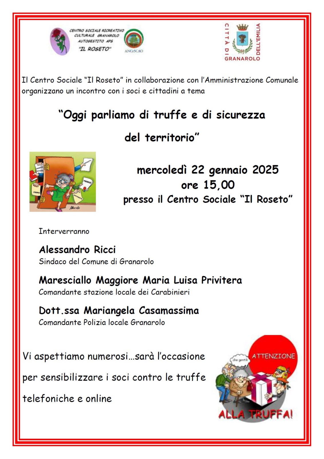Il Centro Sociale “Il Roseto”, in collaborazione con l’Amministrazione Comunale, organizza un incontro dedicato alla sensibilizzazione contro le truffe telefoniche e online.