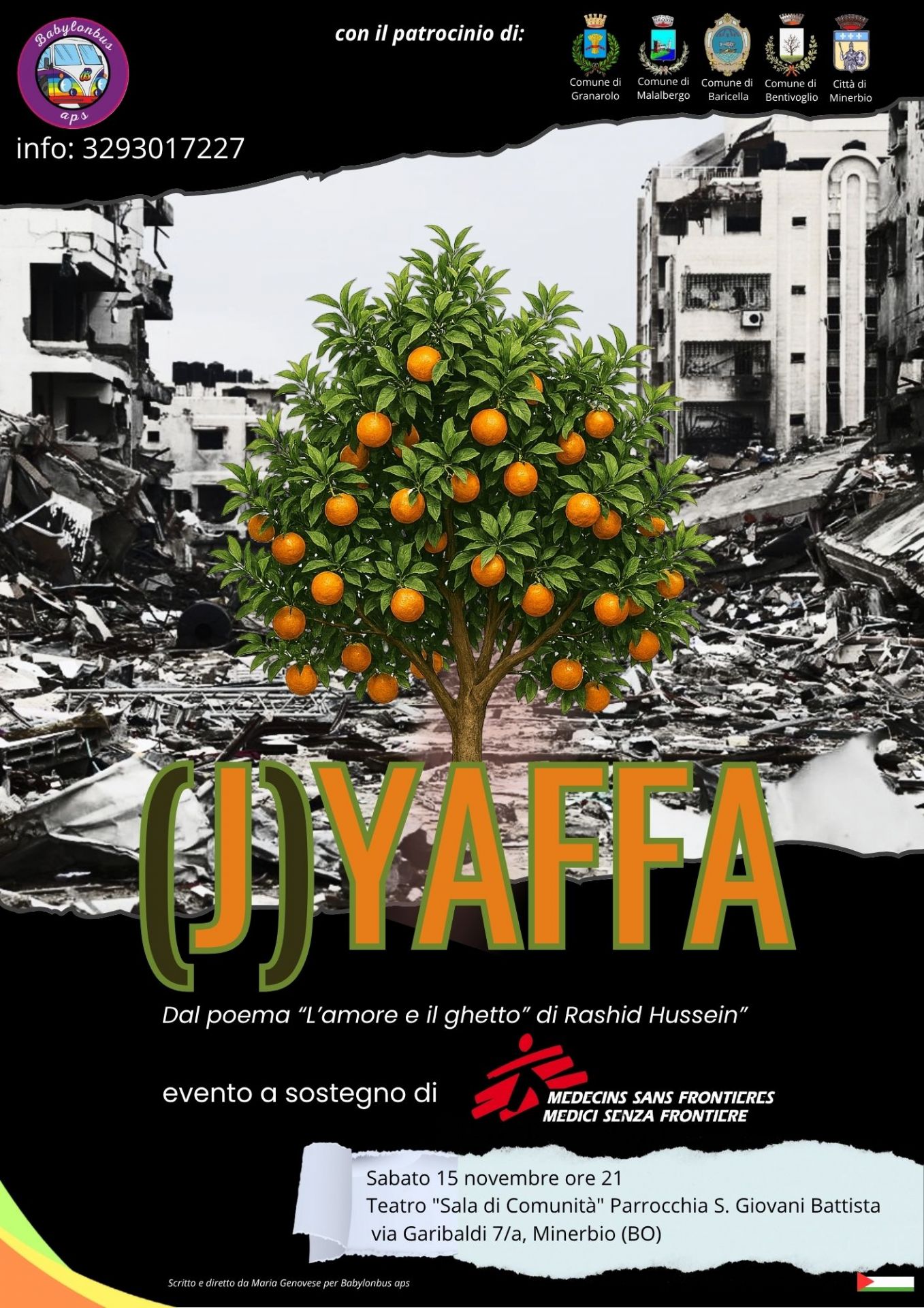 Il Comune di Minerbio invita i cittadini all’evento (J)YAFFA, ispirato al poema “L’amore e il ghetto” di Rashid Hussein, sabato 15 novembre alle 21:00 presso il Teatro "Sala di Comunità" della Parrocchia S. Giovanni Battista.