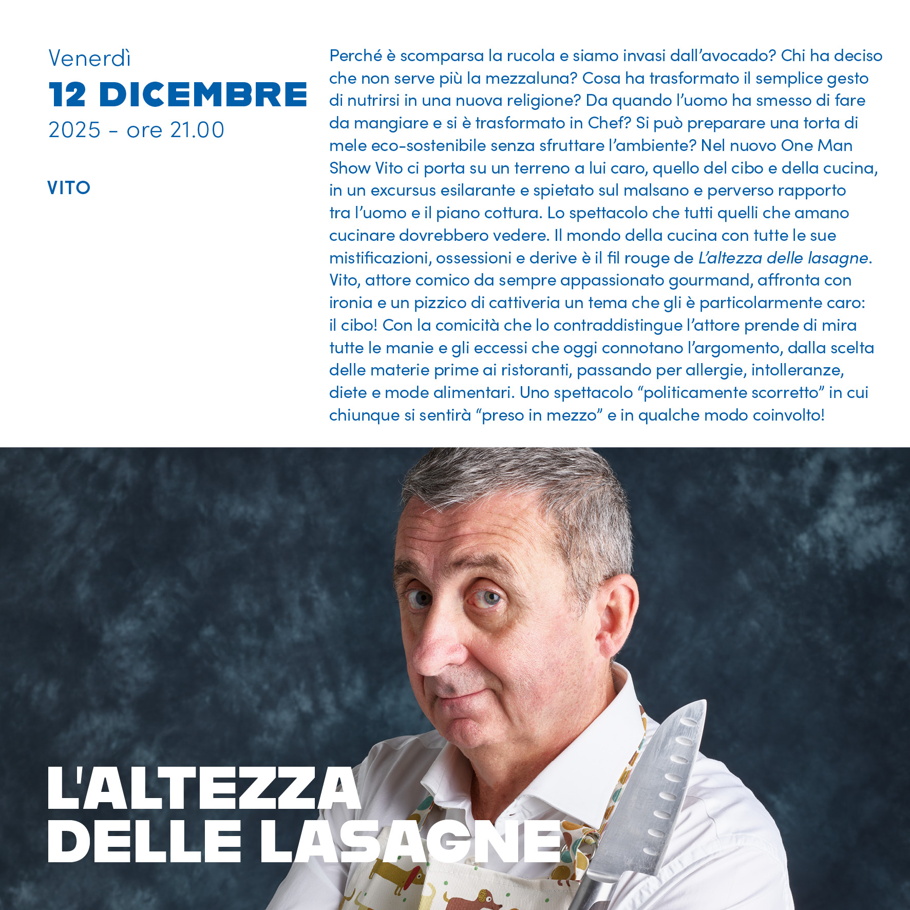 Il mondo della cucina con tutte le sue mistificazioni, ossessioni e derive è il fil rouge de “L’altezza delle lasagne”. Vito, attore comico da sempre appassionato gourmand e conduttore di seguitissime trasmissioni di cucina (tra cui “Vito con i suoi” su Gambero Rosso Channel), affronta con ironia e un pizzico di cattiveria un tema che gli è particolarmente caro: il cibo! Con la comicità che lo contraddistingue l’attore prende di mira tutte le manie e gli eccessi che oggi connotano l’argomento, dalla scelta delle materie prime ai ristoranti, passando per allergie, intolleranze, diete e mode alimentari.
