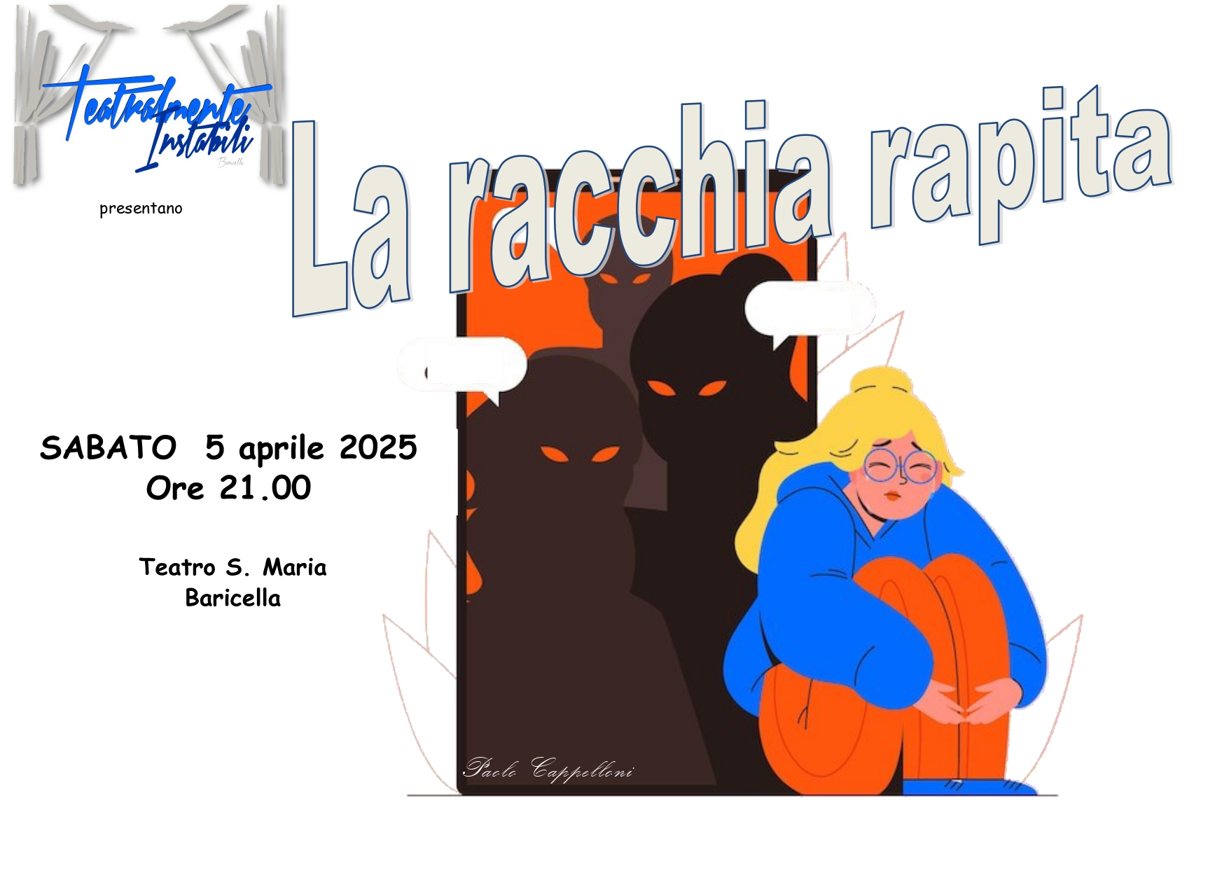 Sabato 5 Aprile 2025 alle ore 21:00 andrà in scena al Cinema Teatro Santa Maria di Baricella lo Spettacolo teatrale per beneficenza La racchia rapita commedia in 2 atti di Paolo Cappelloni, a cura della Compagnia I teatralmente instabili di Baricella. Regia di Margarida Garcia.