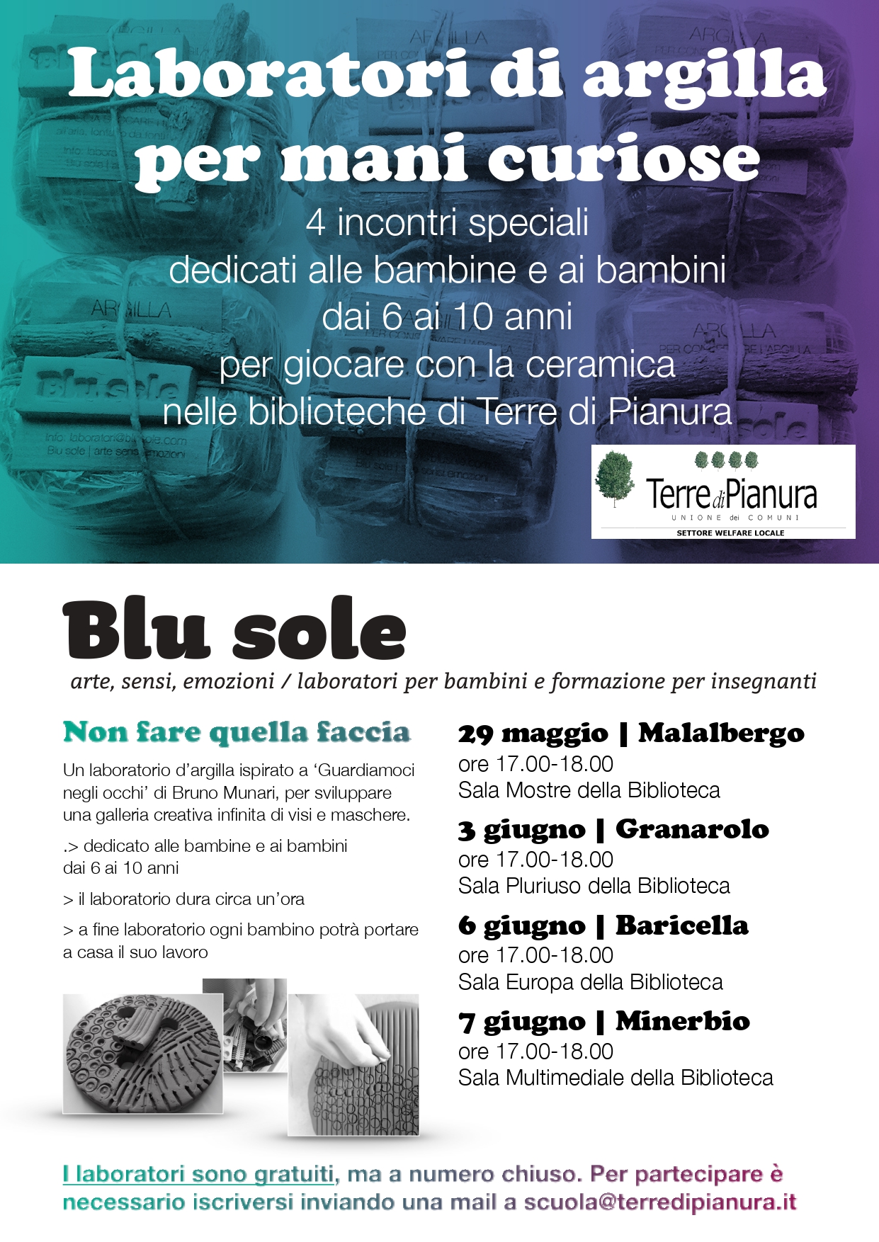 Un laboratorio d'argilla ispirato a "Guardiamoci negli occhi" di Bruno Munari, per sviluppare una galleria creativa infinita di visi e maschere, dedicato alle bambine e ai bambini dai 6 ai 10 anni. Il laboratorio dura circa un'ora. A fine laboratorio ogni bambino potrà portare a casa il suo lavoro.