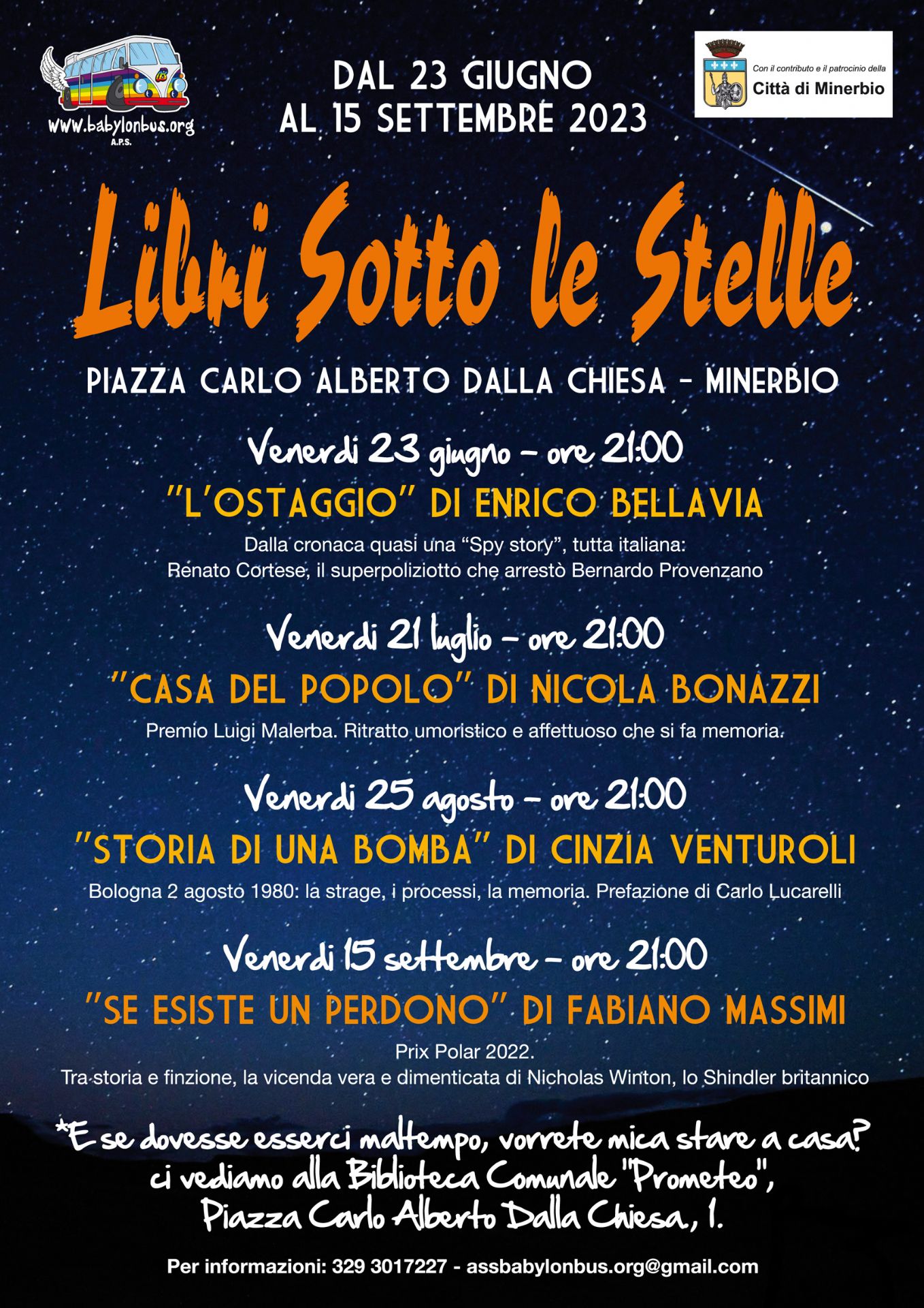 Venerdì 25 agosto 2023 terzo appuntamento con Libri Sotto le Stelle, alle ore 21.00 in Piazza C.A. Dalla Chiesa a Minerbio.