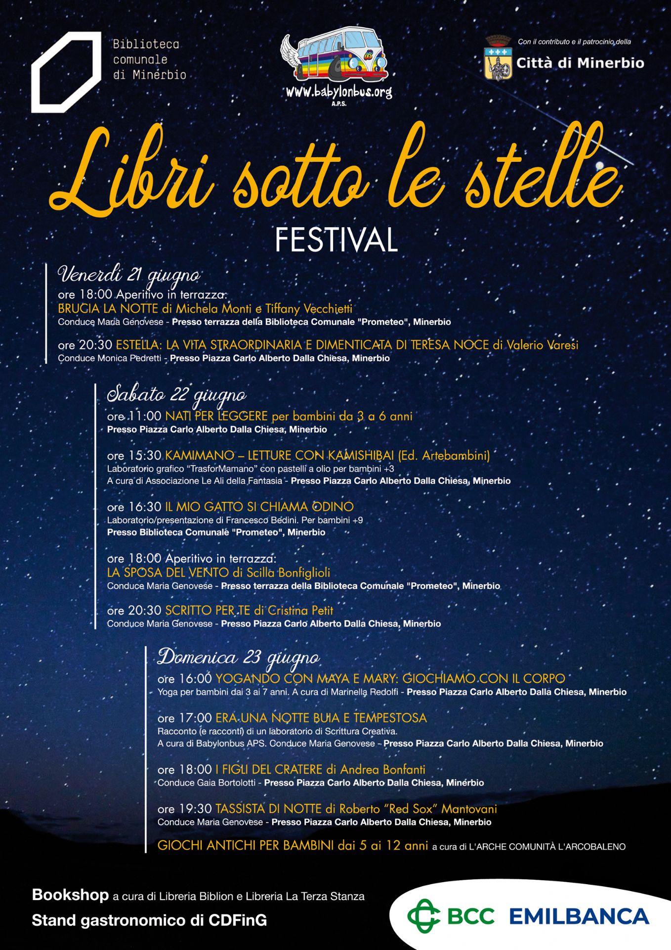 Da venerdì 21 a domenica 23 giugno 2024 si terrà Libri sotto le stelle Festival, organizzato da Babylonbus Aps, con il patrocinio e il contributo del Comune di Minerbio.