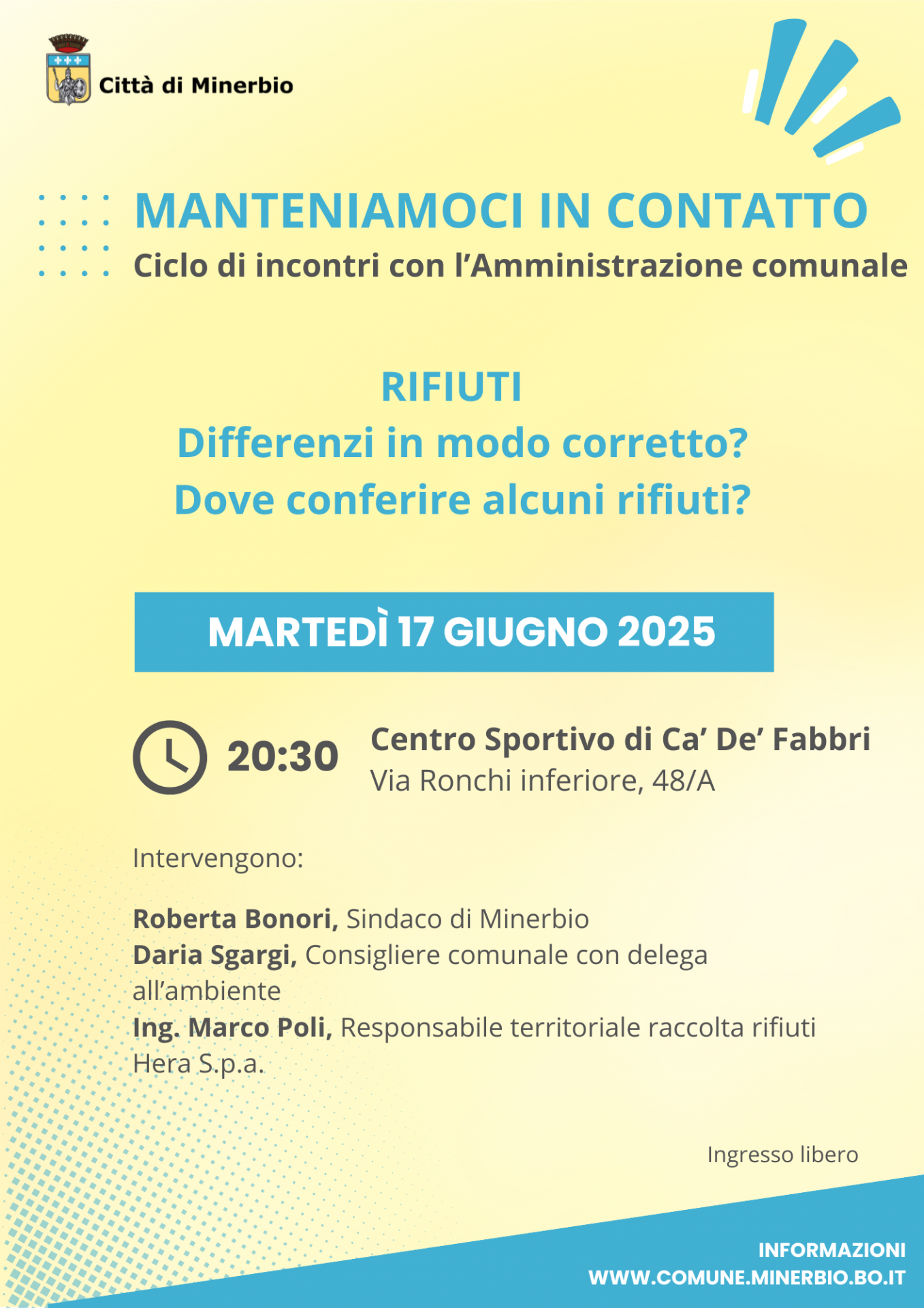 Martedì 17 Giugno 2025, alle ore 20.30 presso il Centro sportivo di Ca' De' Fabbri - via Ronchi Inferiore 48/B - si terrà l'ultimo appuntamento del ciclo di incontri "Manteniamoci in contatto" dal titolo: " Rifiuti: differenzi in modo corretto? Dove conferire alcuni rifiuti?" che si tengono il secondo martedì di ogni mese, per un confronto con l'Amministrazione sui temi di maggiore interesse per i cittadini.