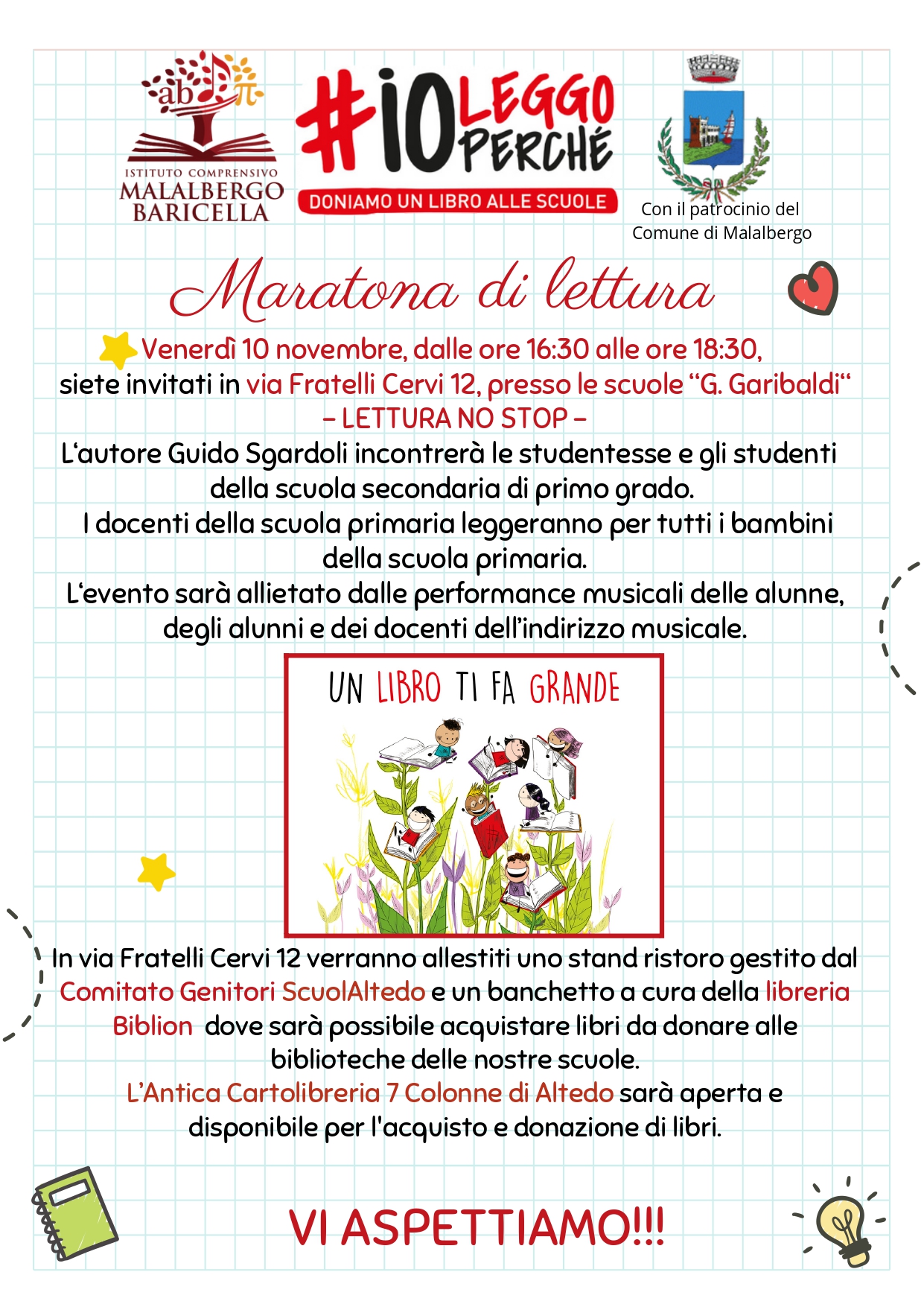 Nell'ambito dell'ottava edizione di #ioleggoperché, venerdì 10 novembre dalle ore 16:30 alle ore 18:30 si terrà l'iniziativa "Maratona di lettura" come da locandina con il programma del pomeriggio.