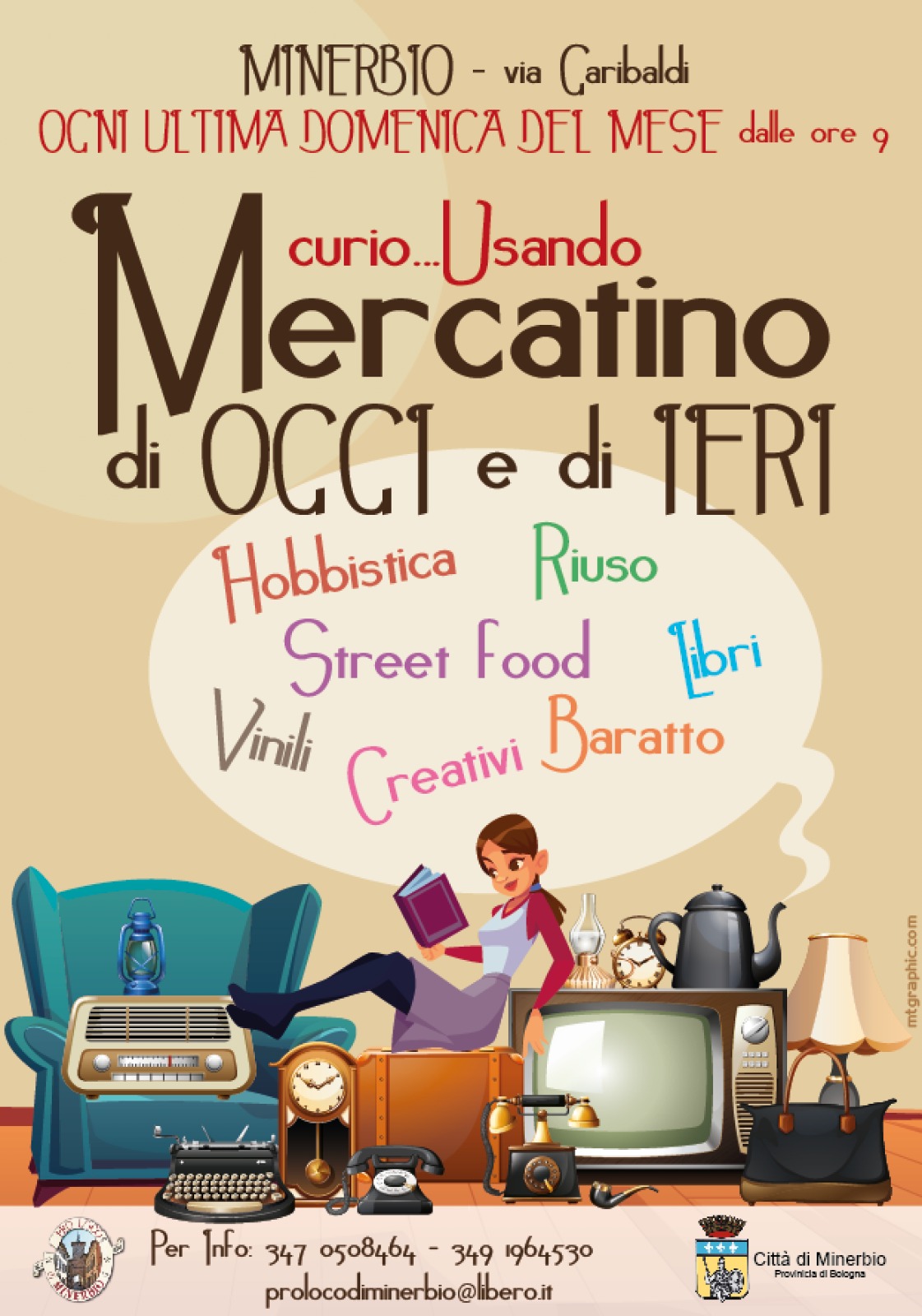 Domenica 30 giugno 2024 lungo via Garibaldi a Minerbio si svolgerà il Mercatino di ieri e di oggi, dalle ore 9.00, organizzato da Pro Loco di Minerbio.