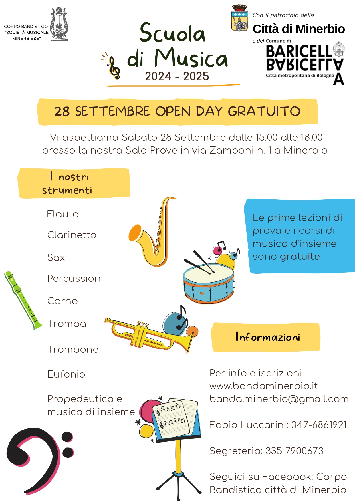 Sabato 28 settembre 2024 dalle ore 15.00 alle ore 18.00 nella Sala Prove in via Zamboni n. 1 a Minerbio si terrà l'Open Day gratuito della Scuola di Musica del Corpo Bandistico Città di Minerbio.