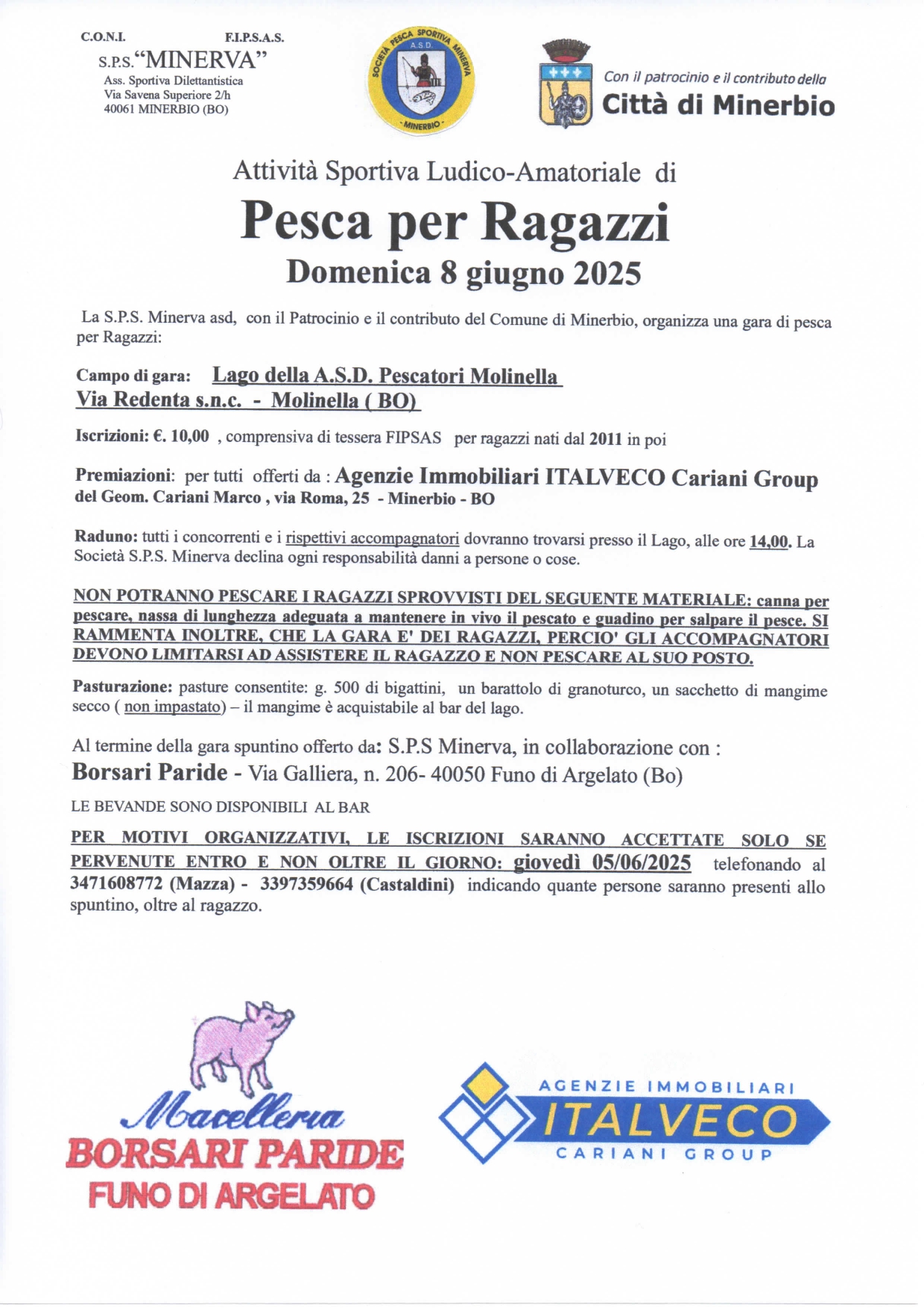Domenica 8 giugno 2025 presso il Lago della A.S.D Pescatori Molinella, in Via Redenta, si svolgerà la Gara di Pesca per Ragazzi, organizzata da Società Pesca Sportiva Minerva Asd.