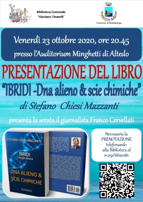 Venerdì 23 ottobre alle ore 20.45 presso l'Auditorium Minghetti di Altedo, si terrà la presentazione del libro "Ibribi - Dna alieno e scie chimiche" di Stefano Chiesi Mazzanti.
