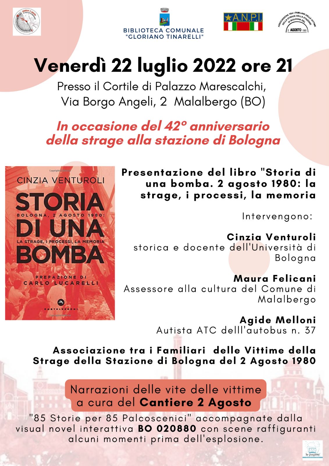 In occasione del 42° anniversario della strage alla stazione di Bologna, venerdì 22 luglio 2022 ore 21 presso il cortile di Palazzo Marescalchi, Via Borgo Angeli 2 Malalbergo (BO) si terrà la presentazione del libro "Storia di una bomba. 2 agosto 1980: la strage, i processi, la memoria".