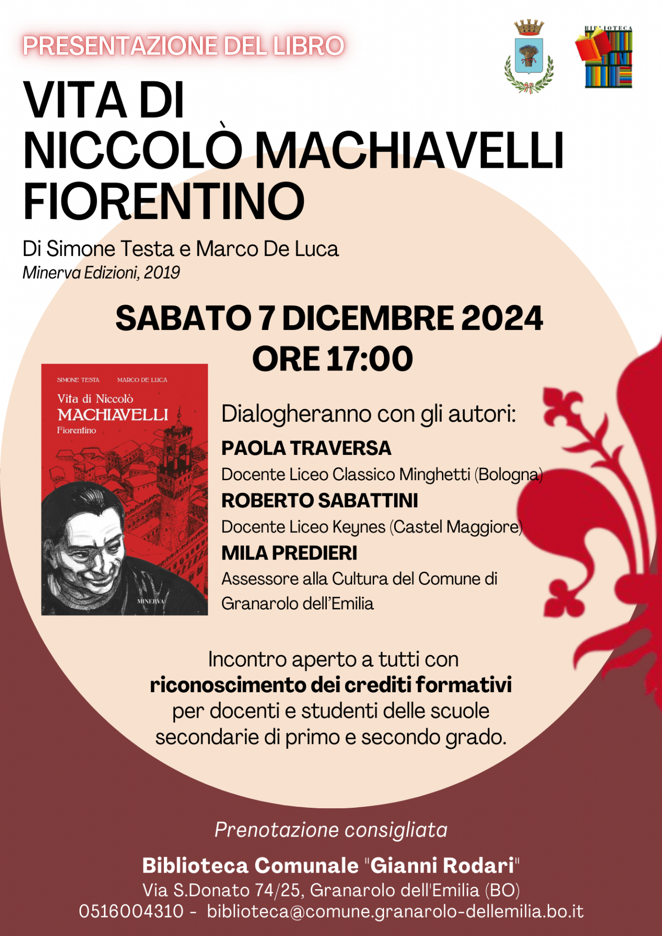 La Biblioteca Comunale "Gianni Rodari" di Granarolo dell'Emilia ospiterà la presentazione del libro Vita di Niccolò Machiavelli Fiorentino, scritto da Simone Testa e Marco De Luca (Minerva Edizioni, 2019). L'evento si terrà sabato 7 dicembre 2024 alle ore 17:00.