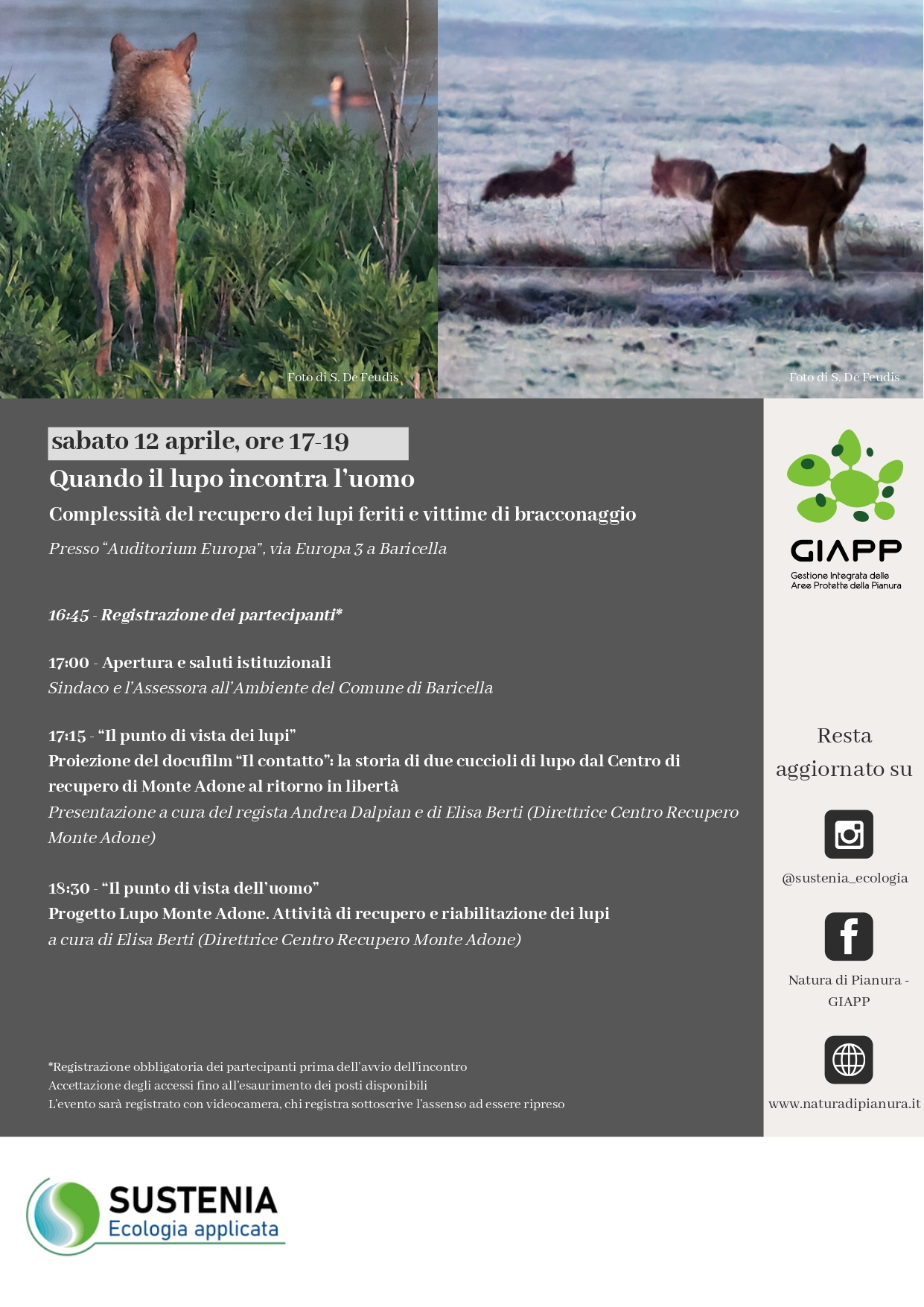 17:15 - “Il punto di vista dei lupi” Proiezione del docufilm “Il contatto”: la storia di due cuccioli di lupo dal Centro di recupero di Monte Adone al ritorno in libertà Presentazione a cura del regista Andrea Dalpian e di Elisa Berti (Direttrice Centro Recupero Monte Adone) 18:30 - “Il punto di vista dell’uomo” Progetto Lupo Monte Adone. Attività di recupero e riabilitazione dei lupi a cura di Elisa Berti (Direttrice Centro Recupero Monte Adone)