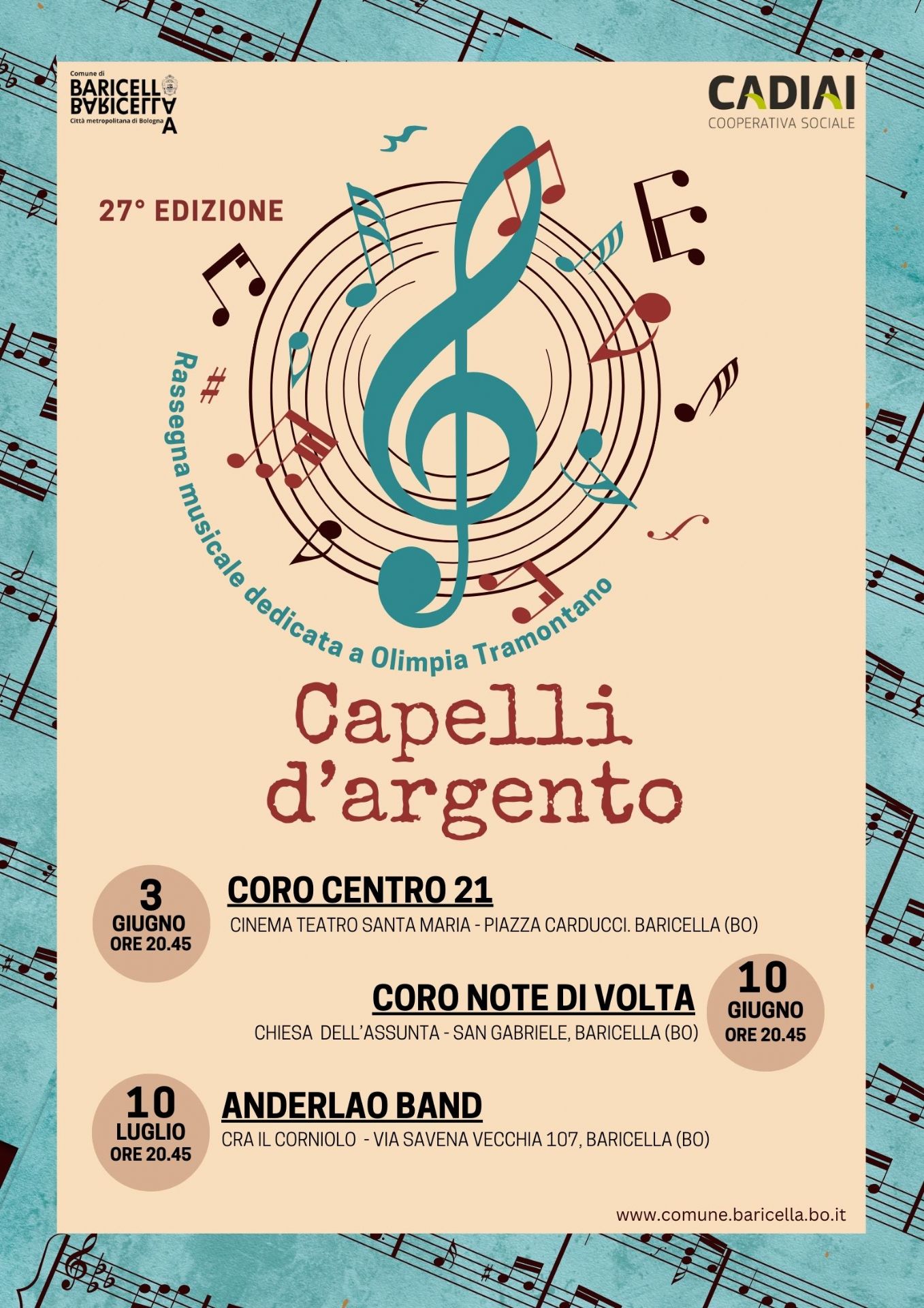 Torna la rassegna musicale tutta baricellese Capelli d’Argento, giunta quest’anno alla 27ª edizione, grazie alla preziosa collaborazione con la Residenza per Anziani “Il Corniolo” di Baricella e Cadiai Cooperativa Sociale!
