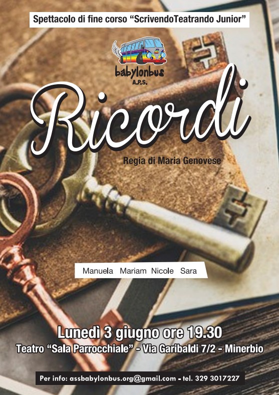 Lunedì 3 giugno 2024 alle ore 19.30 nel teatro Parrocchiale di Minerbio in via G. Garibaldi 7/2 si terrà lo spettacolo di fine corso annuale "ScrivendoTeatrando Junior" di Babylonbus APS, dal titolo RICORDI con la regia Maria Genovese.