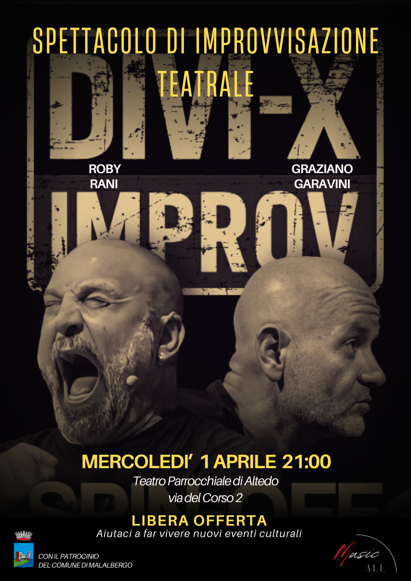 L'associazione Music All con il patrocinio del Comune di Malalbergo , per il terzo degli appuntamenti della sua Rassegna di Primavera ospita sul palco i DIVI-X, il duo formato da Roby Rani e Graziano “Gara” Garavini, improvvisatori con oltre 20 anni di esperienza sui palchi di tutta Italia.