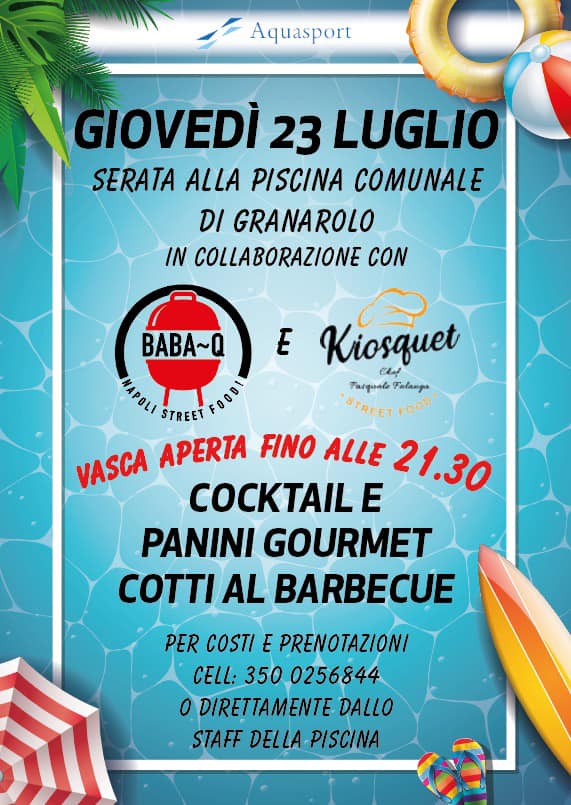 Giovedì 23 luglio la piscina di Granarolo resterà aperta fino alle ore 21.30 e invita a trascorrere una piacevole serata in compagnia, sorseggiando cocktail e cenando con gustosi panini cotti al bbq.