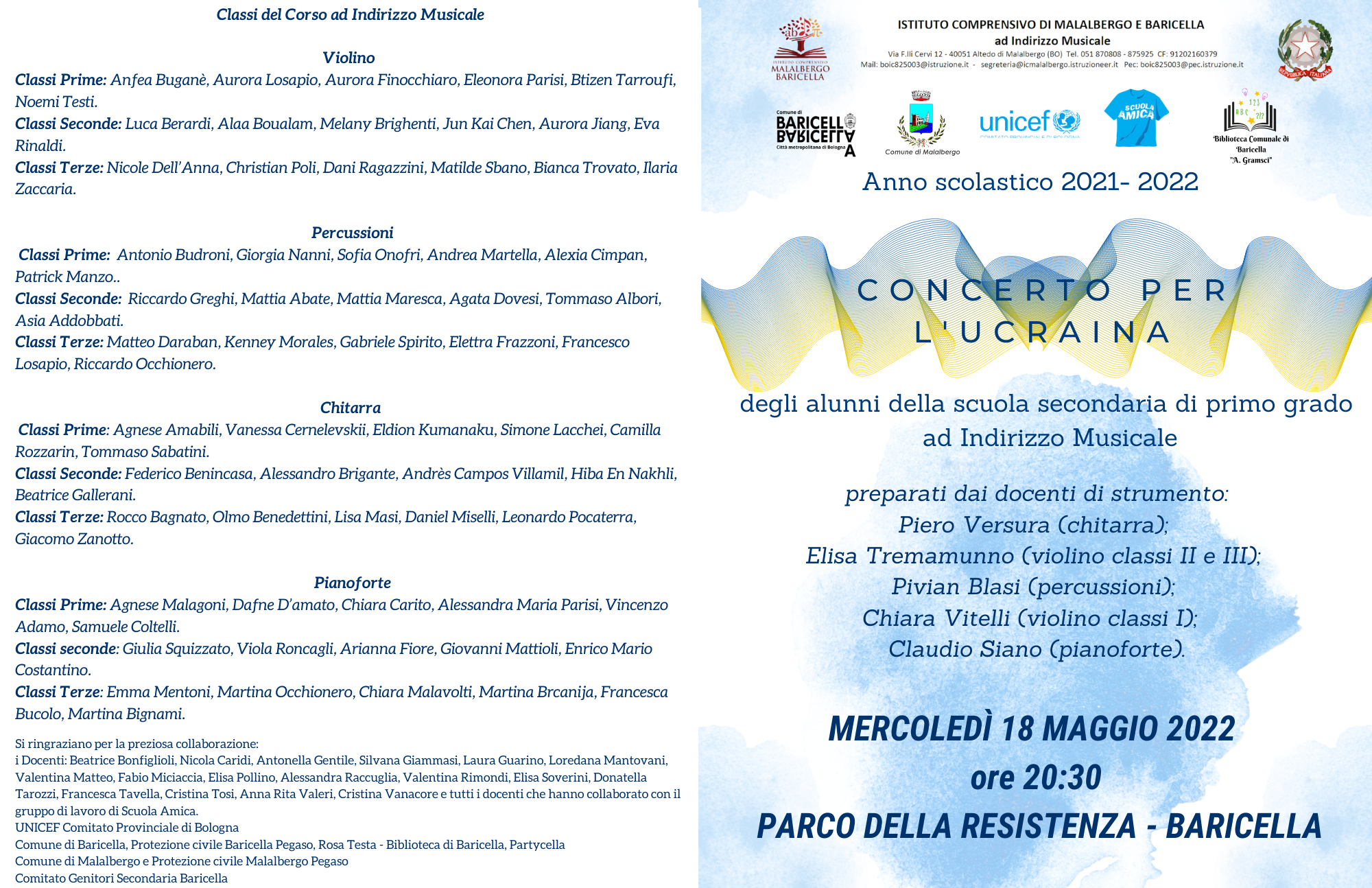 Il 18 maggio dalle ore 17:30 l'Unicef in collaborazione con l'Istituto comprensivo Malalbergo -Baricella, il Comune di Baricella e il Comune di Malalbergo organizzerà, nel parco della Resistenza, in Via Europa 1, a Baricella, la "Serata per la pace".